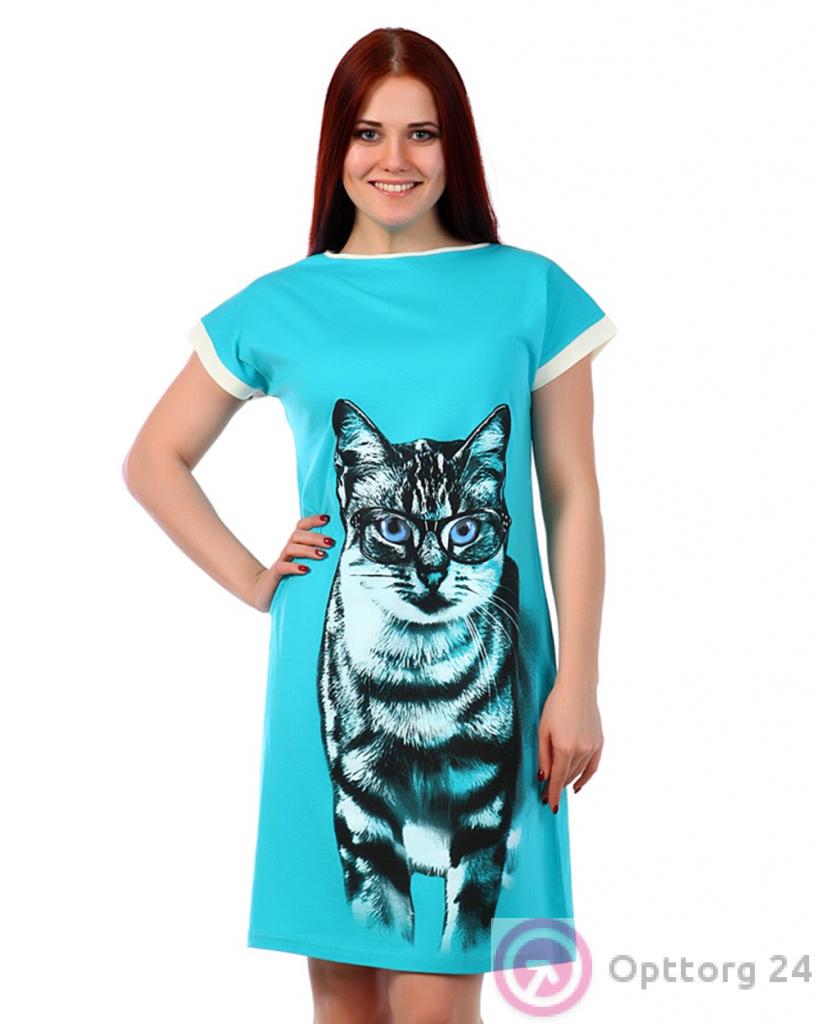 Трикотажная туника голубого цвета с кошечкой. оптом