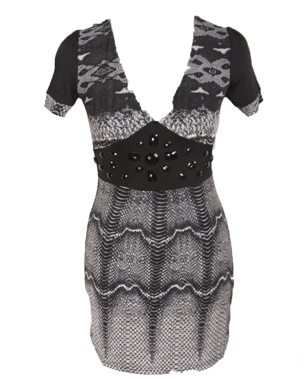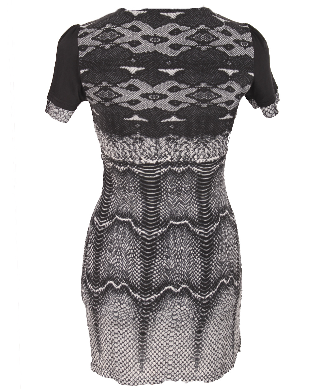 Женская туника черно-серого цвета с глубоким вырезом и элегантным узором.