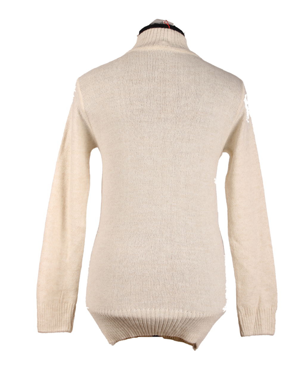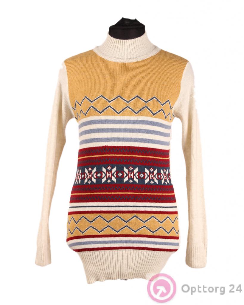 Комфортная шерстяная туника с длинными рукавами и высоким воротником. Модель выполнена в молочном цвете, спереди красивый разноцветный геометрический рисунок. Спинка однотонная. Горловина и низ изделия обвязаны резинкой. Туника хорошо носится, мягкая и приятная на ощупь. Отлично согревает в прохладное время года.