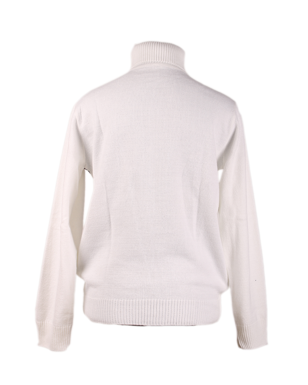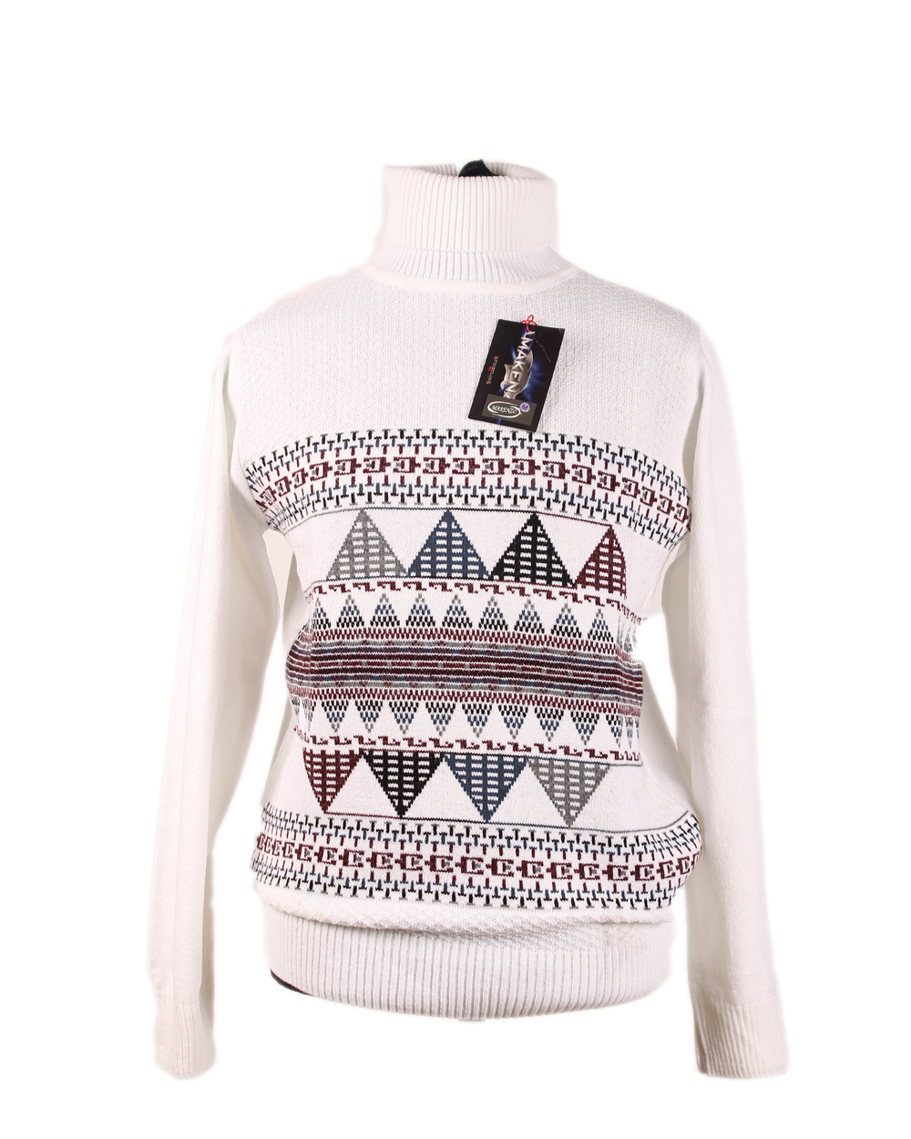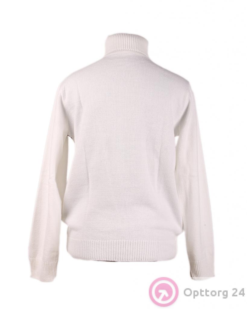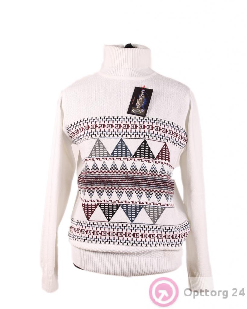 Теплая и удобная женская туника белого цвета, выполнена из шерстяной пряжи. Модель на длинный рукав с высоким воротником под шею, связаный резинкой. Спереди симпатичным геометрический рисунок. Свитер очень мягенький и приятный к телу, будет незаменимым в прохладное время года. Благодаря светлой расцветки туника смотрится очень нарядно.