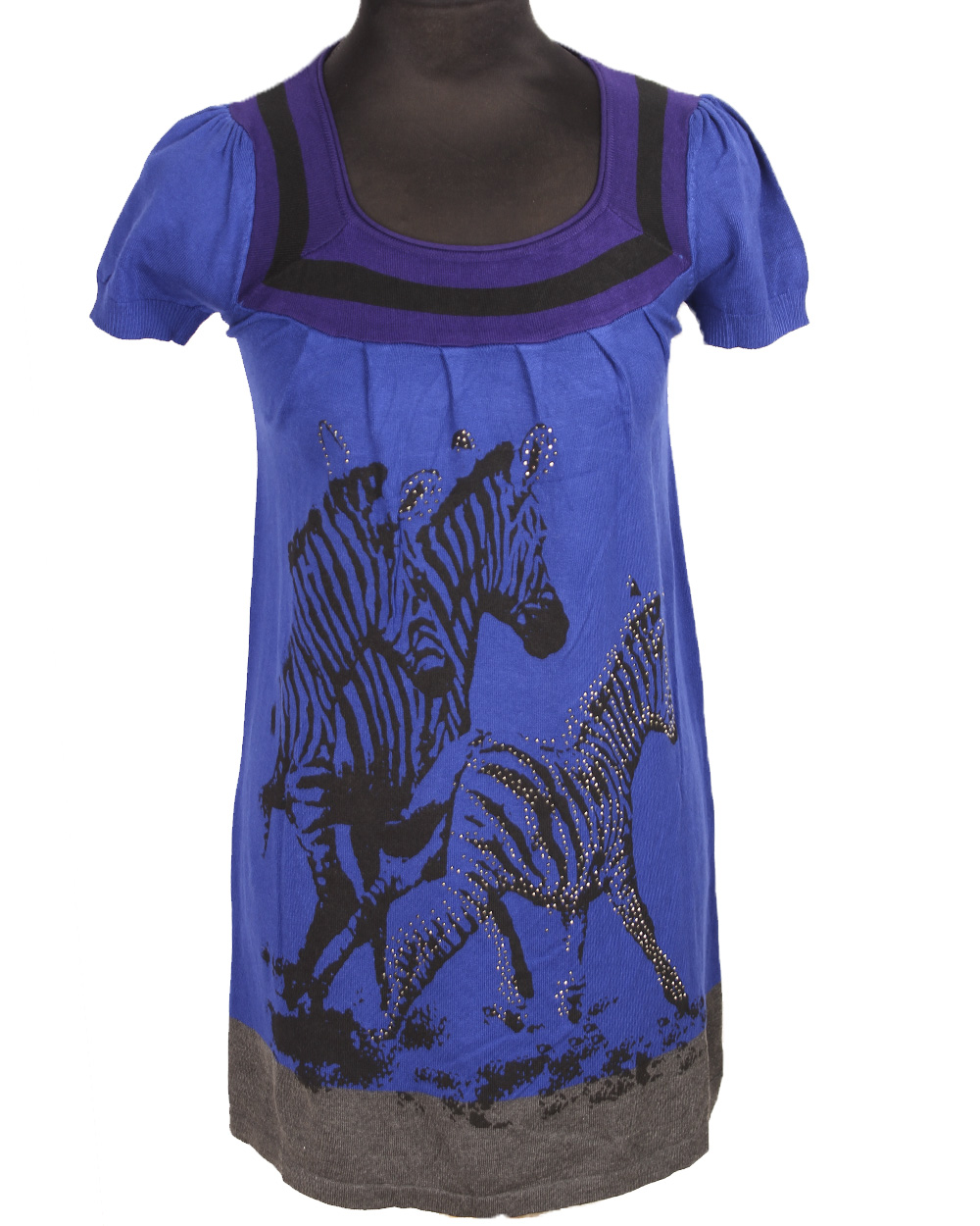 Стильная женская туника синего цвета воротник украшен фиолетовой окантовкой. На модели нанесен рисунок в виде силуэта зебры украшен мелким бисером.