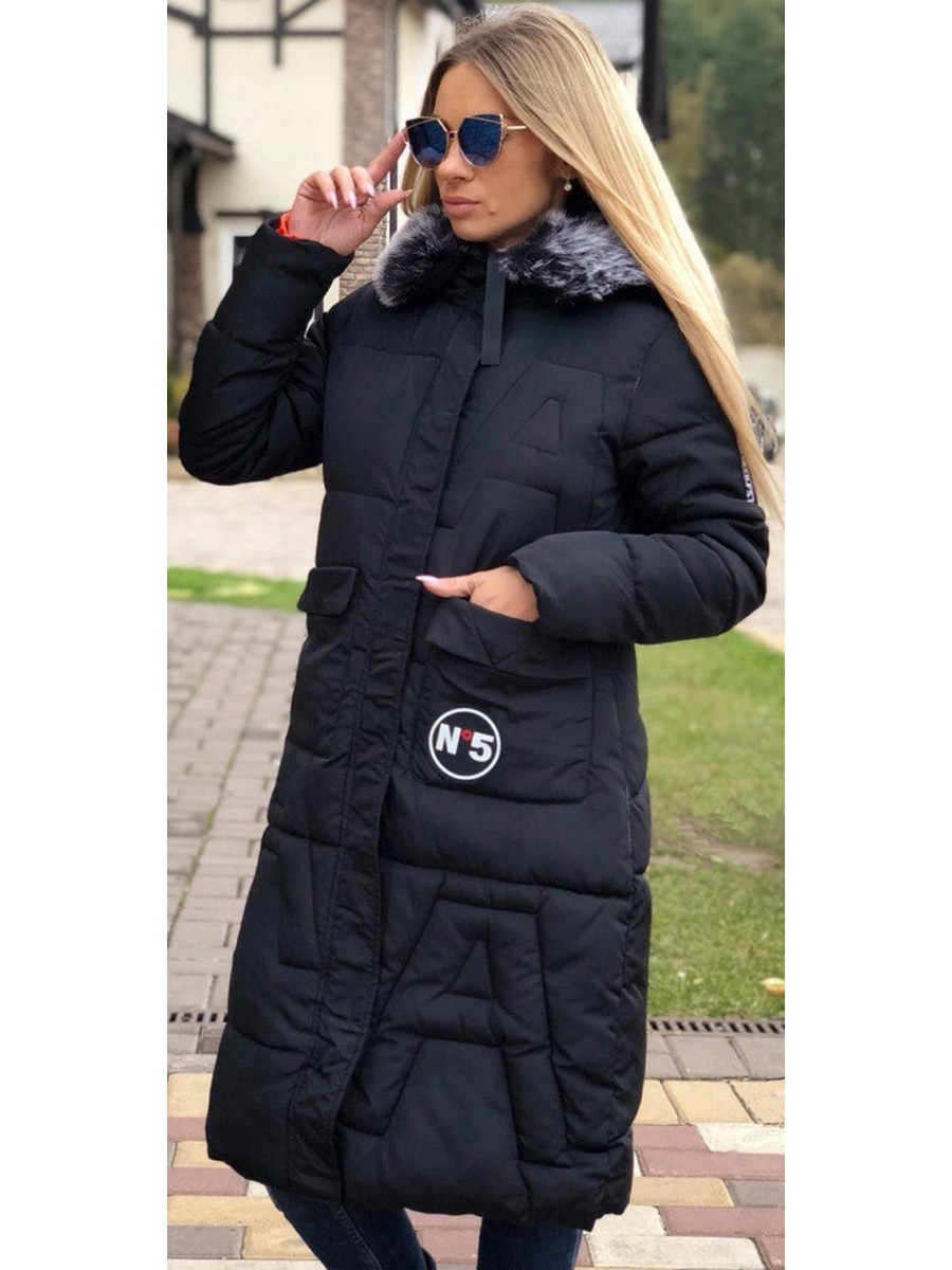 Женская куртка черного цвета с большими карманами и капюшоном с мехом. В центре - молния. Свободный силуэт.