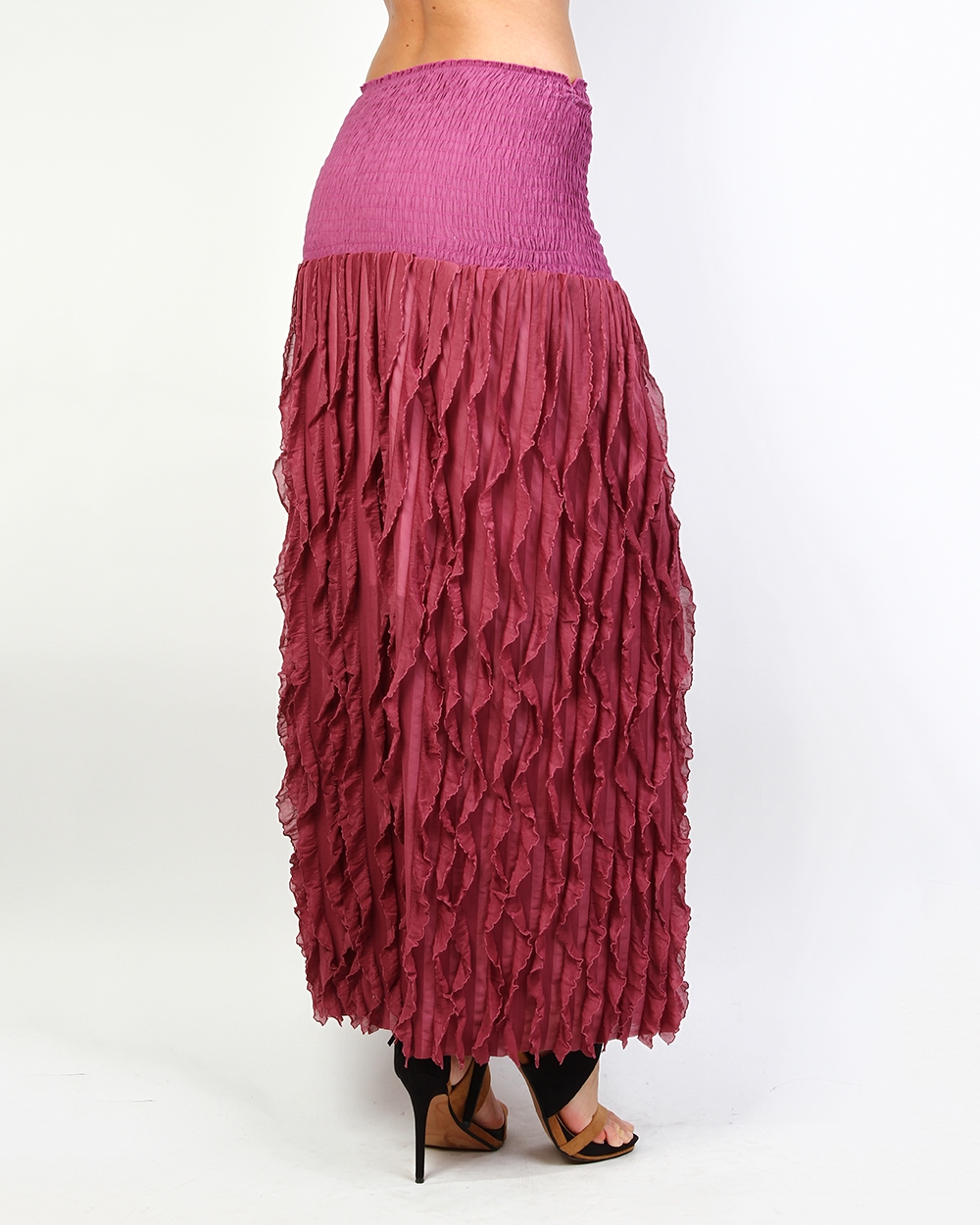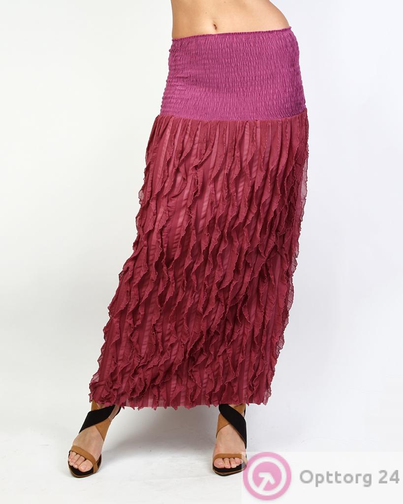 Насыщенный бордовый оттенок этой юбки прекрасно сочетается с необычным кроем. Аккуратная резинка на поясе создает более точеный силуэт, а воланы добавляют легкости.