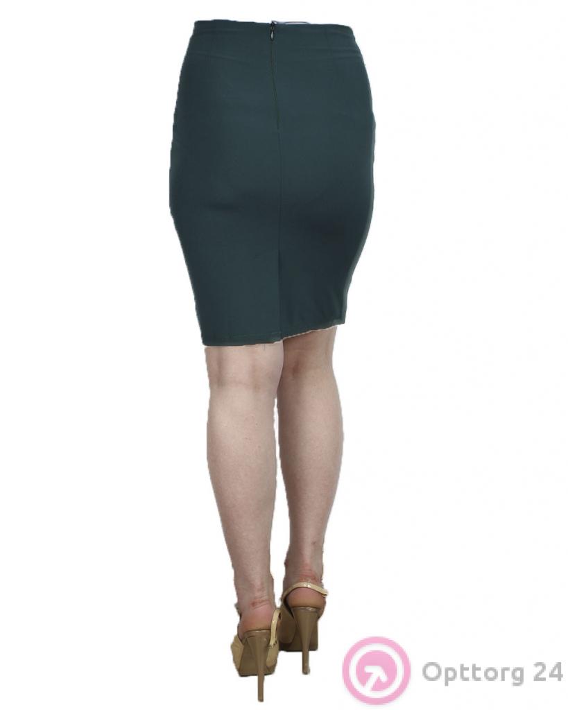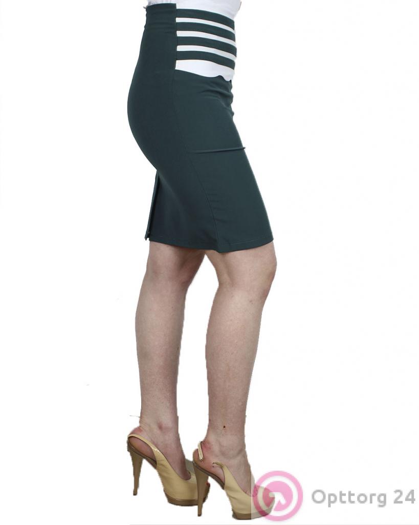 Женская юбка-карандаш тёмно-зеленого цвета с белыми горизонтальными полосками на верхней части изделия.