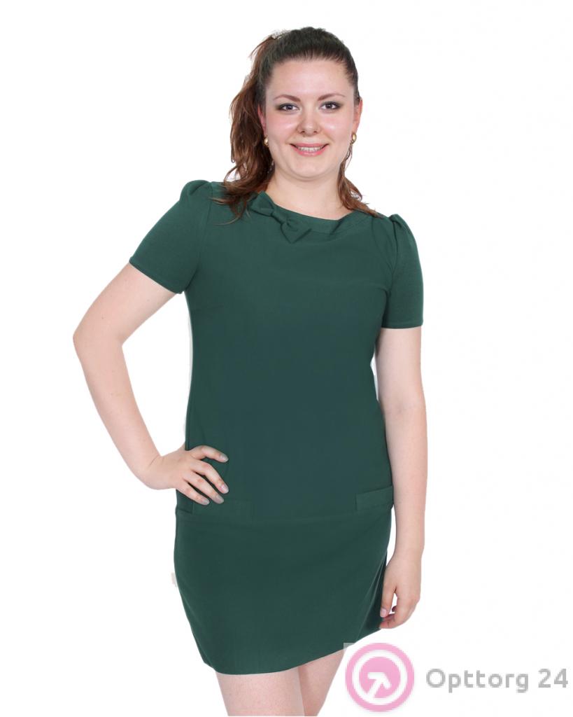 Красивое зеленое платье из приятного на ощупь трикотажа. На горловине красуется маленький бантик, который придает образу игривый вид. Два кармана обманки удачно сочетаются с достаточно строгим покроем.