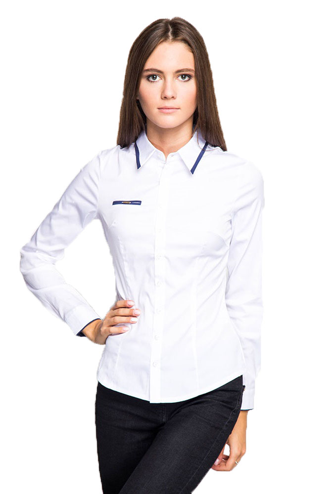 Женсая блузка белоснежного цвета, модель украшена тёмно- синей окантовкой на воротнике.