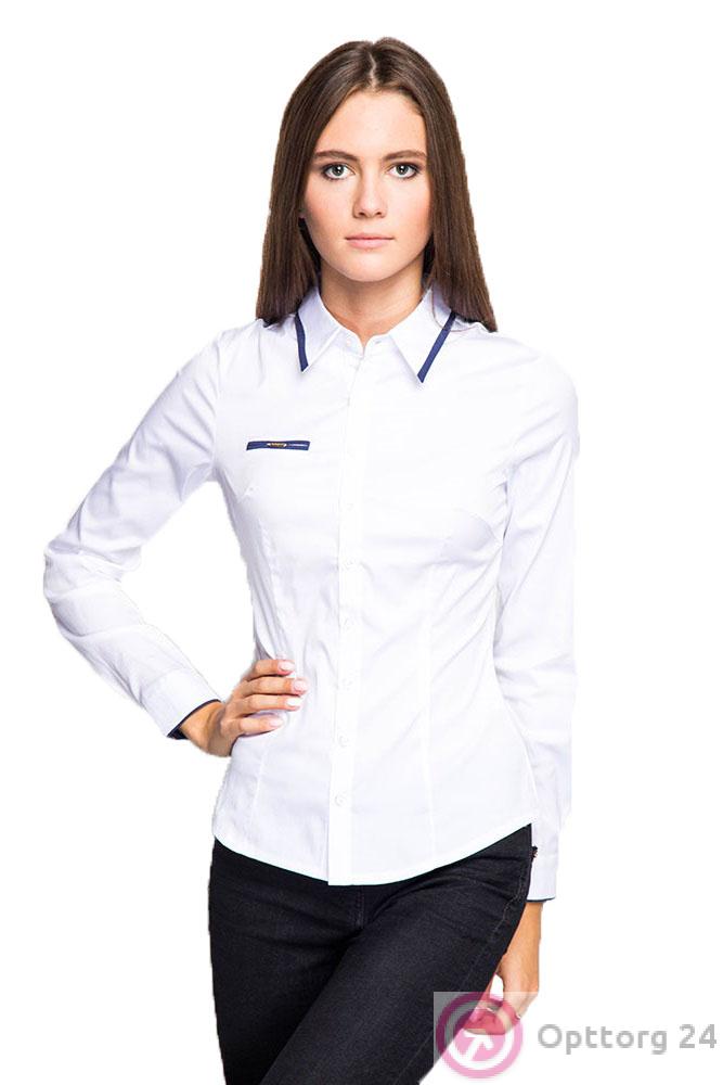 Женская блузка белого цвета с синей окантовкой на воротнике. оптом