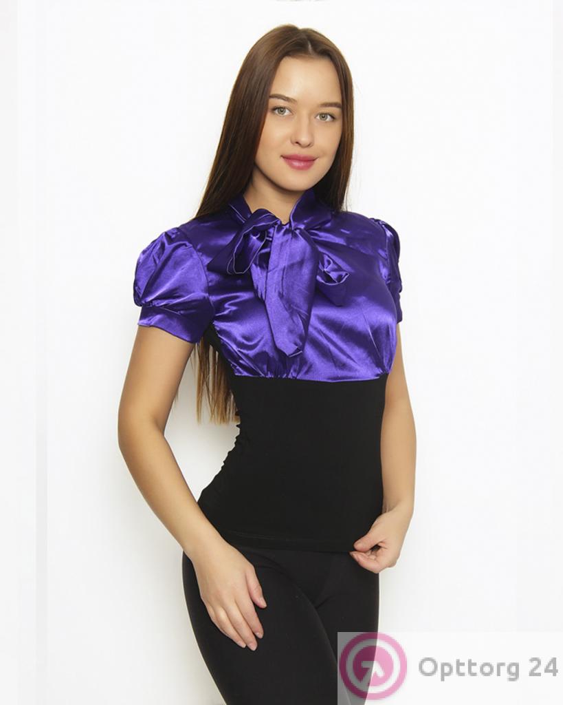 Женская блузка черно-фиолетового цвета с атласным верхом и бантом на вороте.