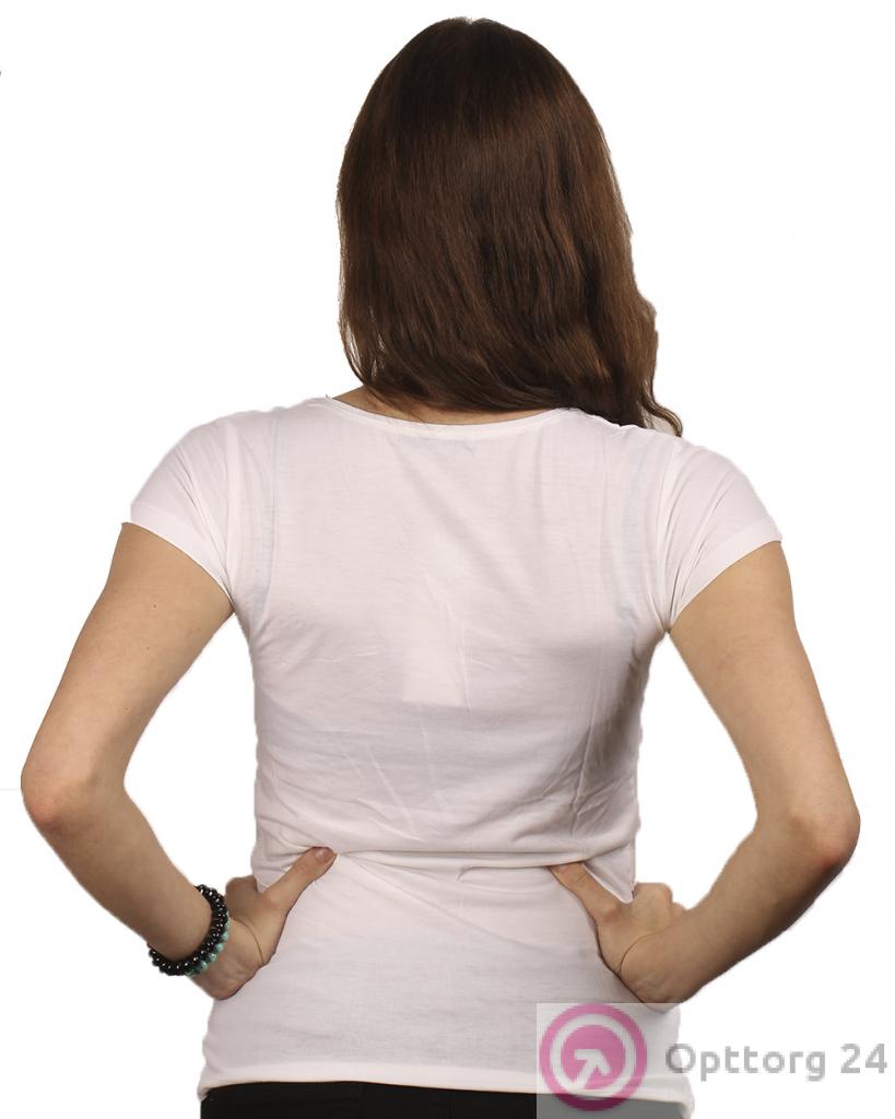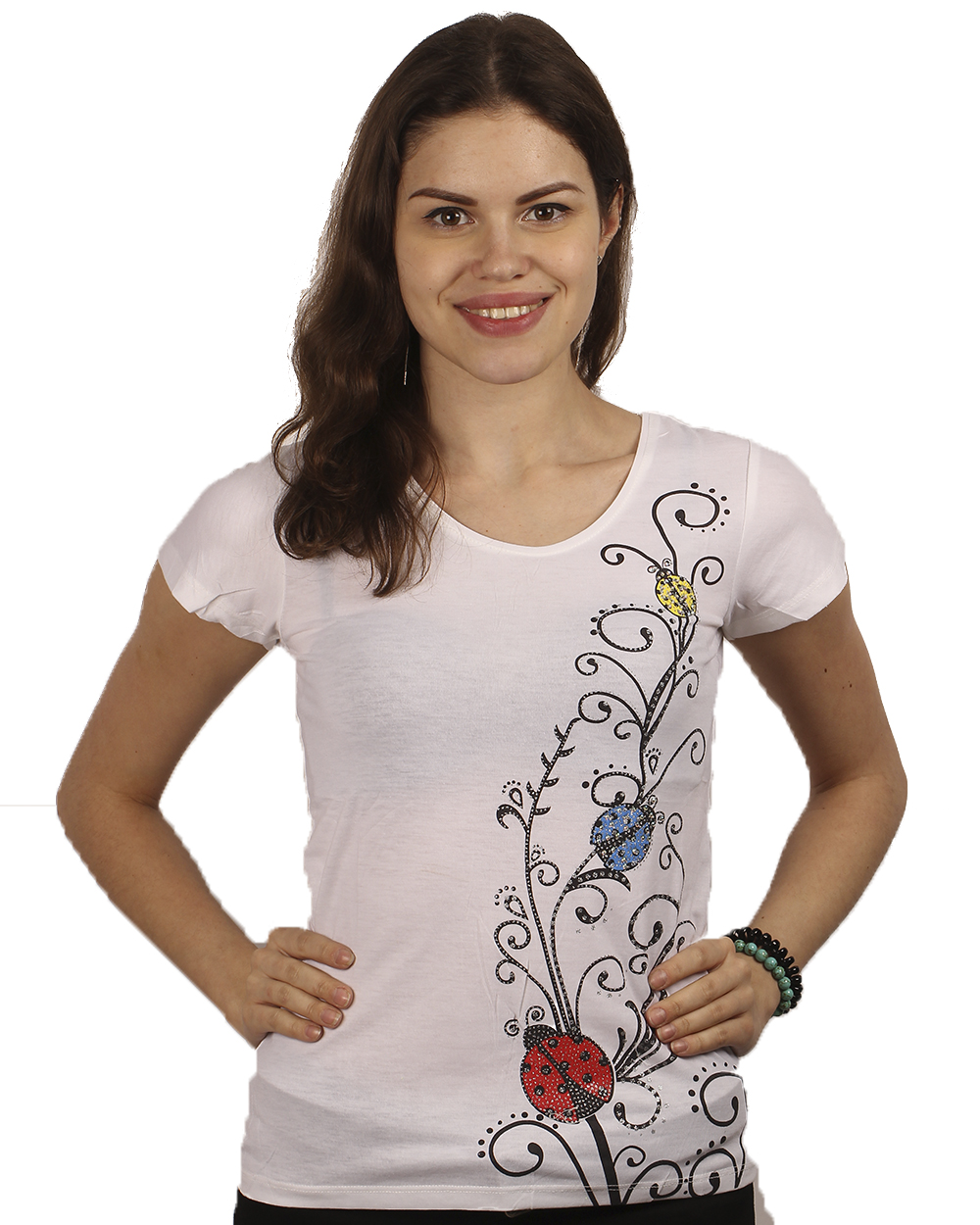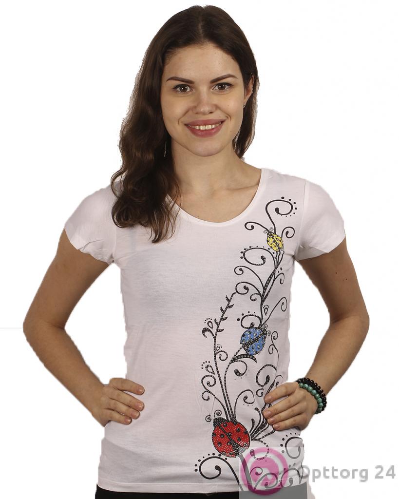 Женская футболка белого цвета с рисунком в виде цветов и божьей коровкой. оптом