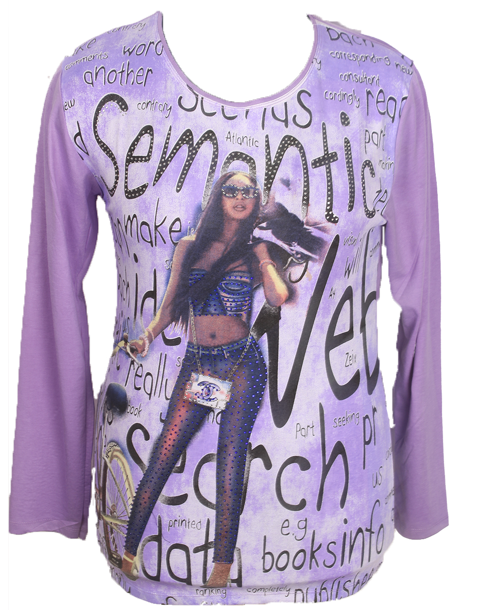 Женская футболка фиолетового цвета с принтом в виде девушки.