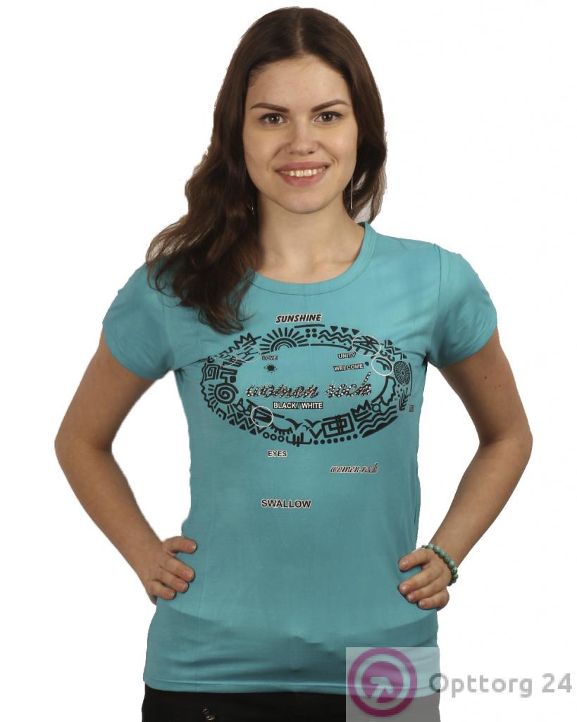 Женская футболка голубого цвета с рисунком и надписями на груди. оптом
