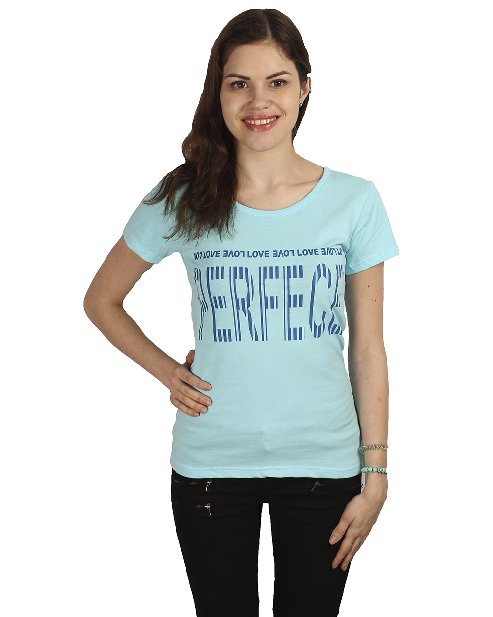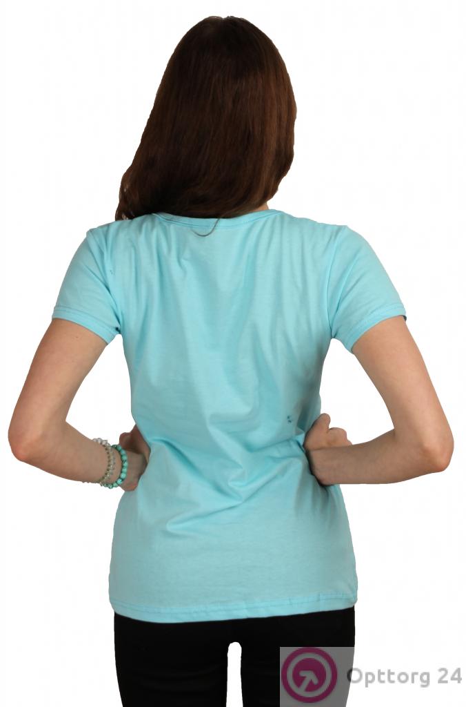 Женская футболка голубого цвета с принтом нанесенным на переднюю часть изделия.
