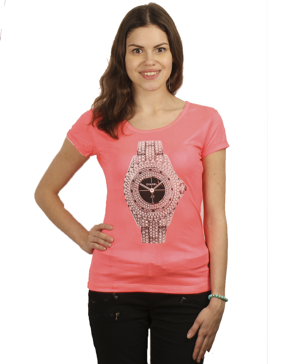 Женская футболка розового цвета с принтом в виде часов со стразами.
