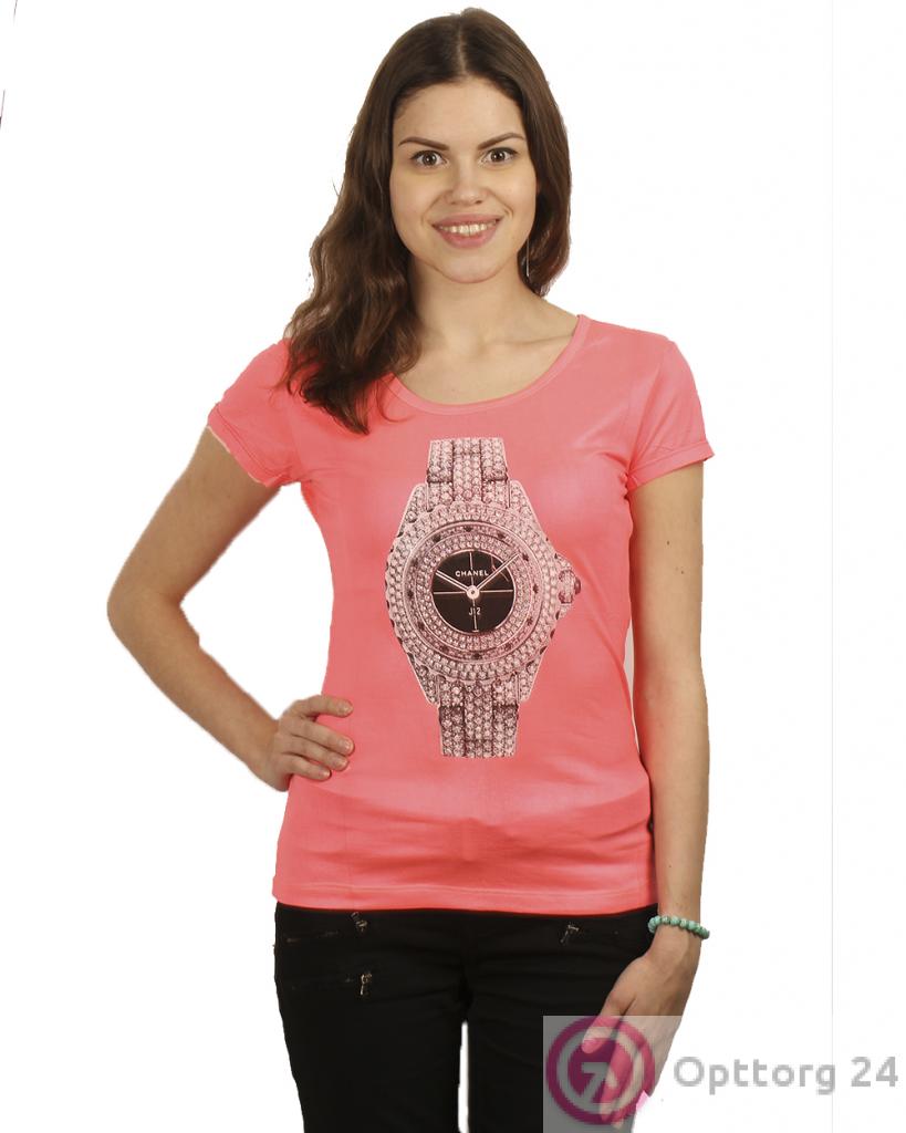 Женская футболка розового цвета с рисунком в виде часов. оптом
