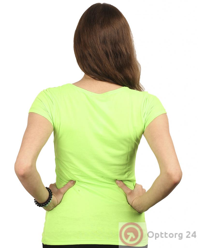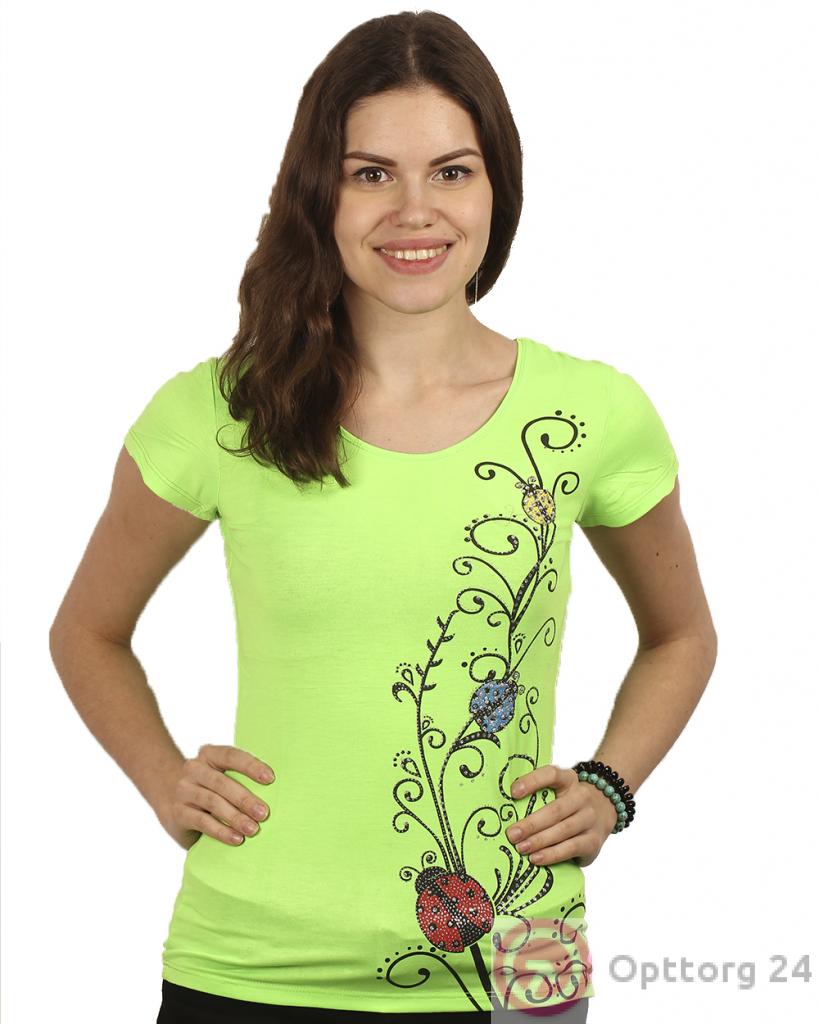 Женская приталенная футболка салатового цвета с рисунком в виде цветка с божьей-коровкой.