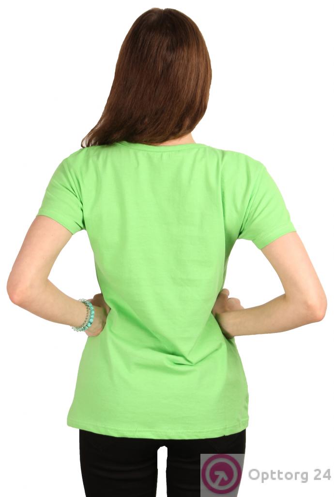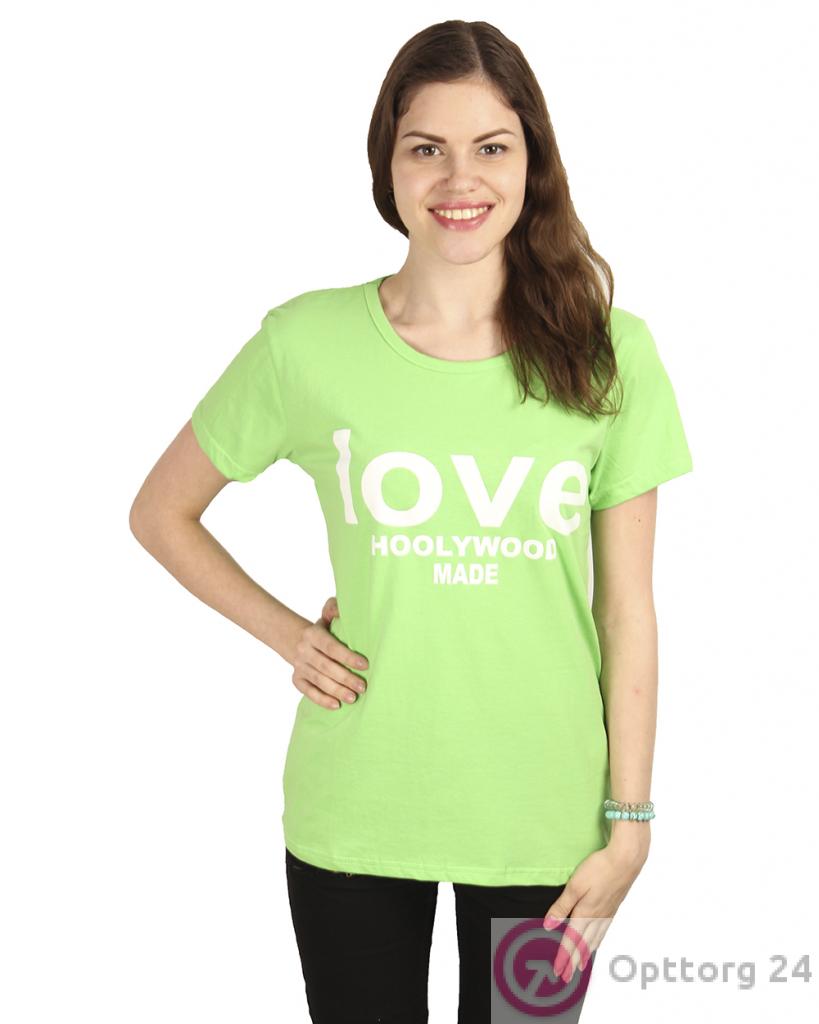 Женская футболка ярко-салатового цвета с белой надписью на передней части изделия.