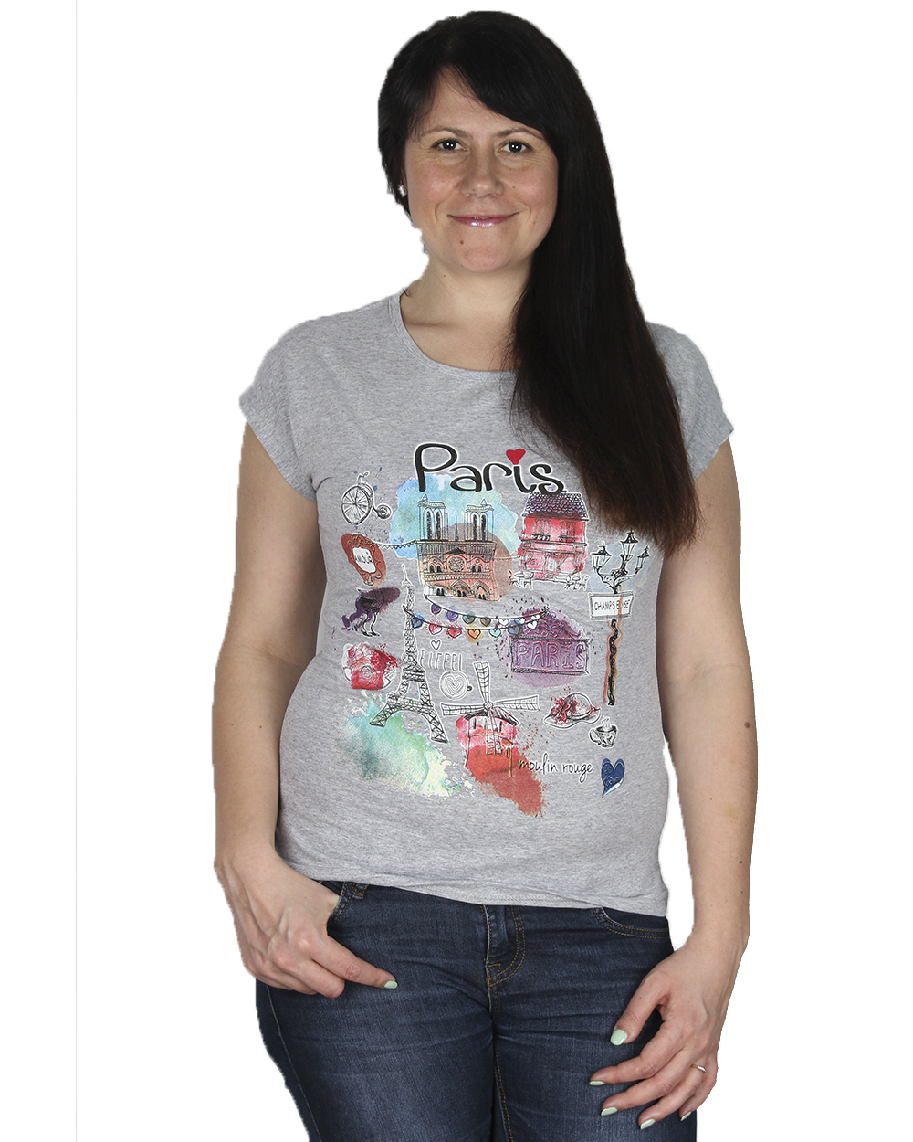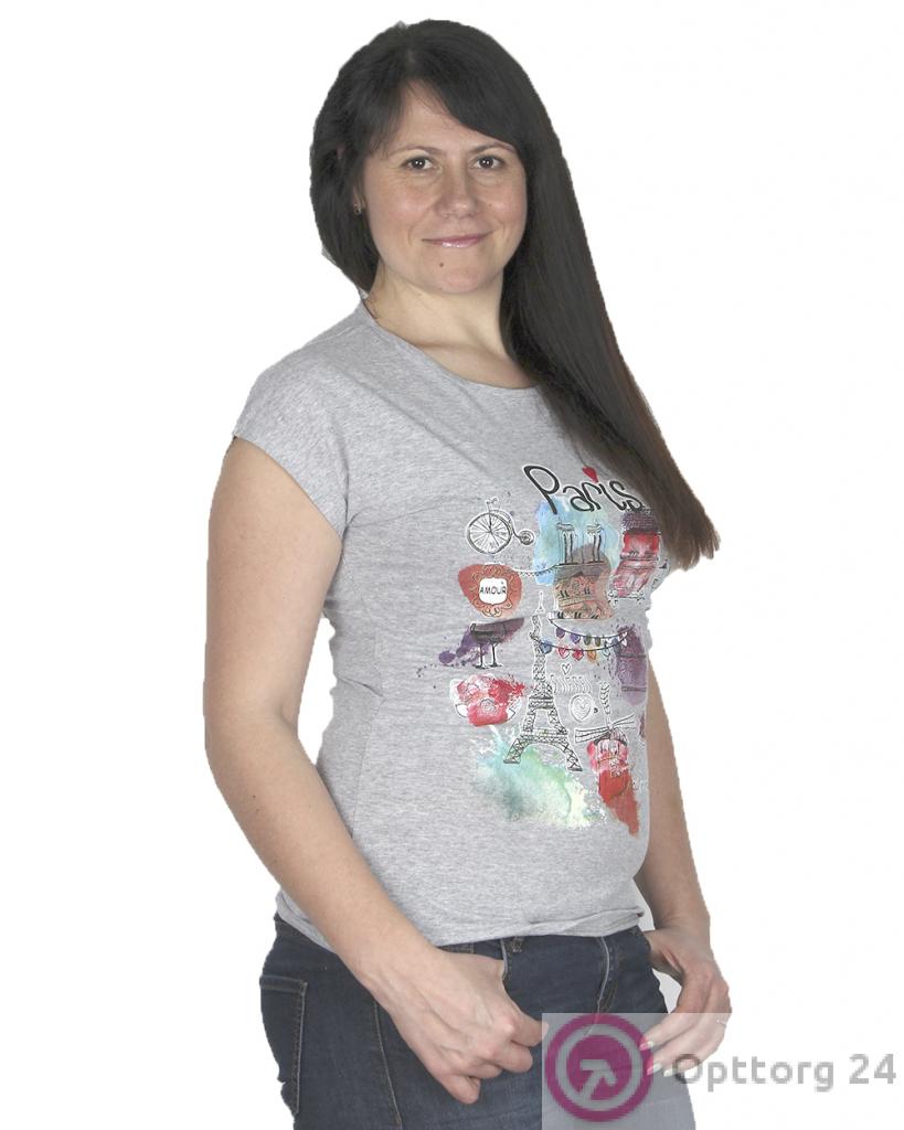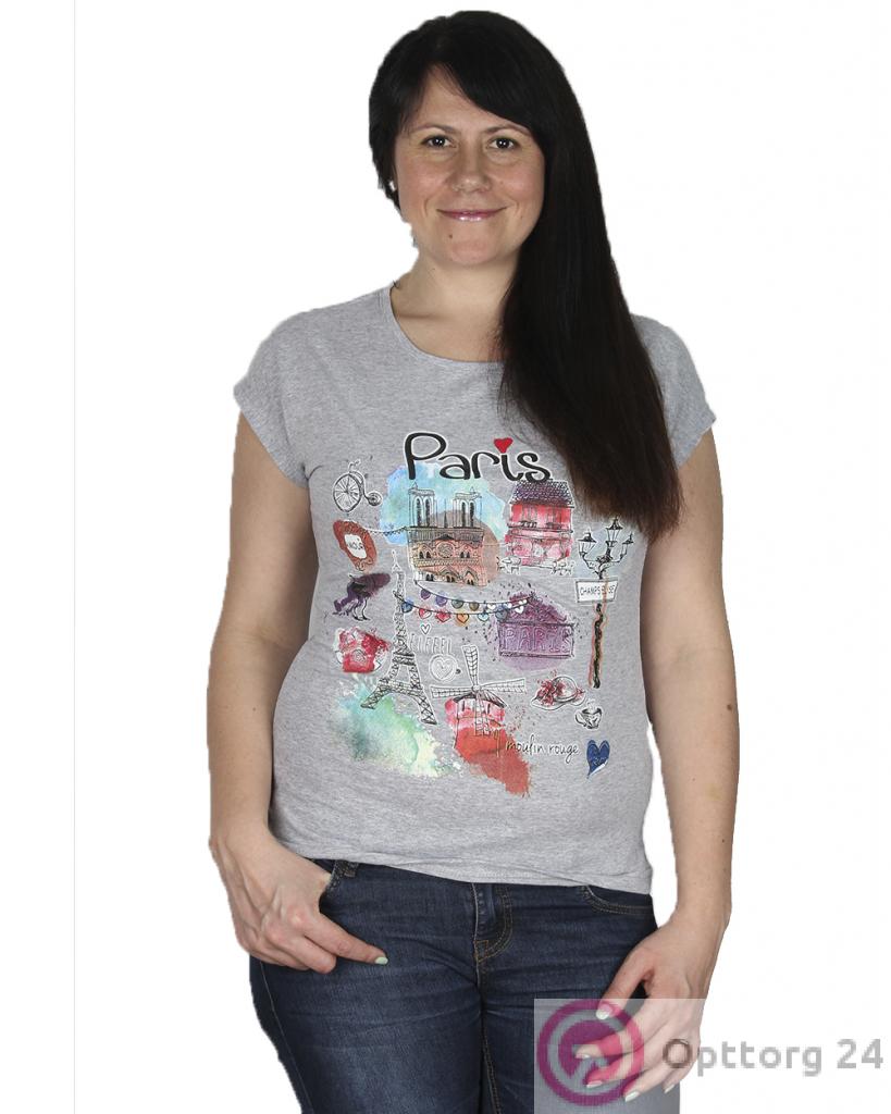Женская футболка серого цвета с принтом в виде парижских достопримечательностей.