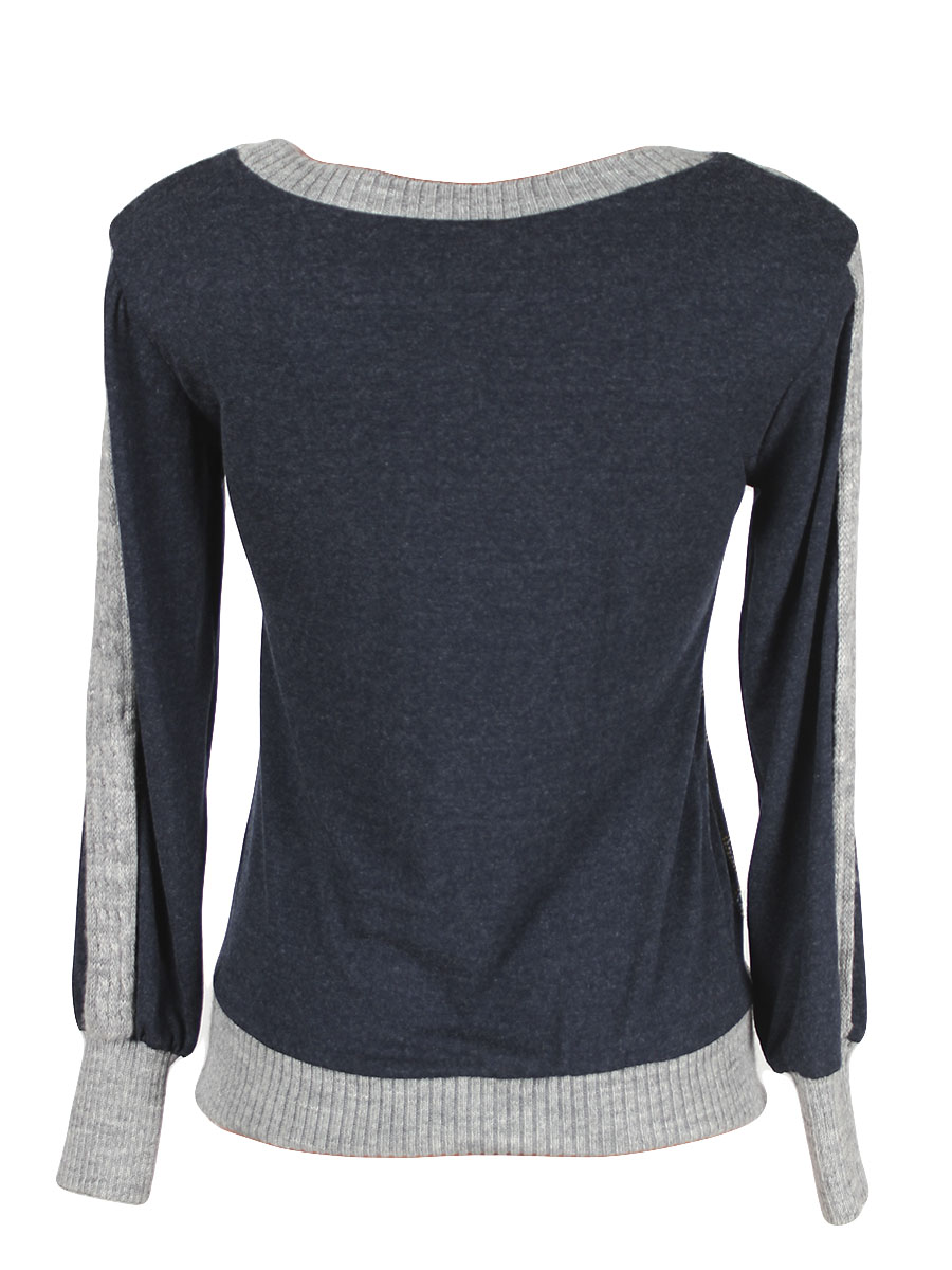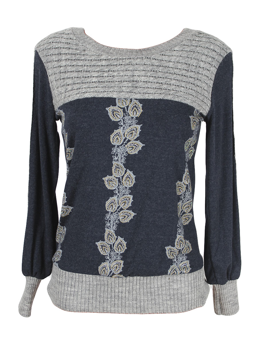 Женская кофта темно-синего цвета украшенные серой вязкой со стразами.
