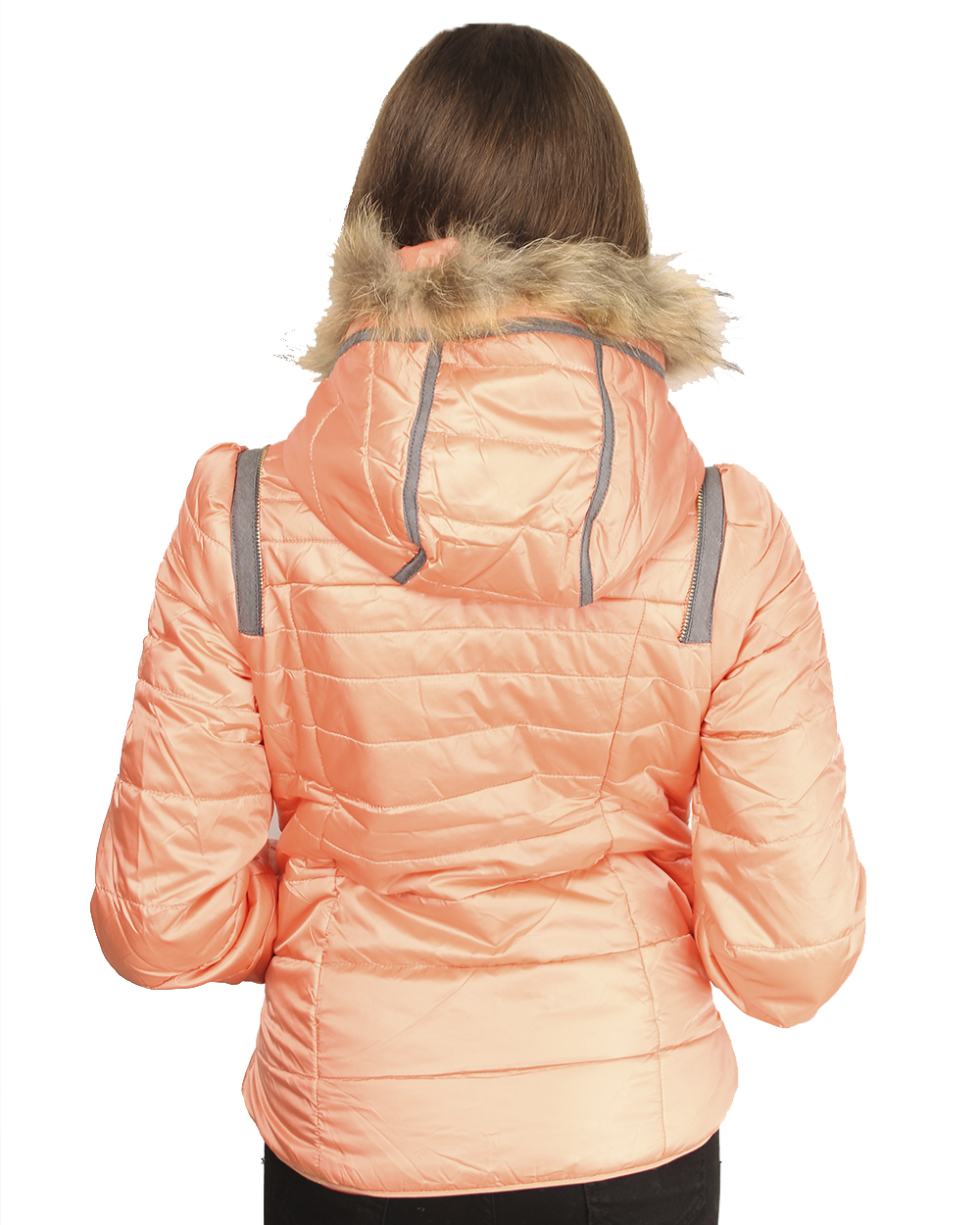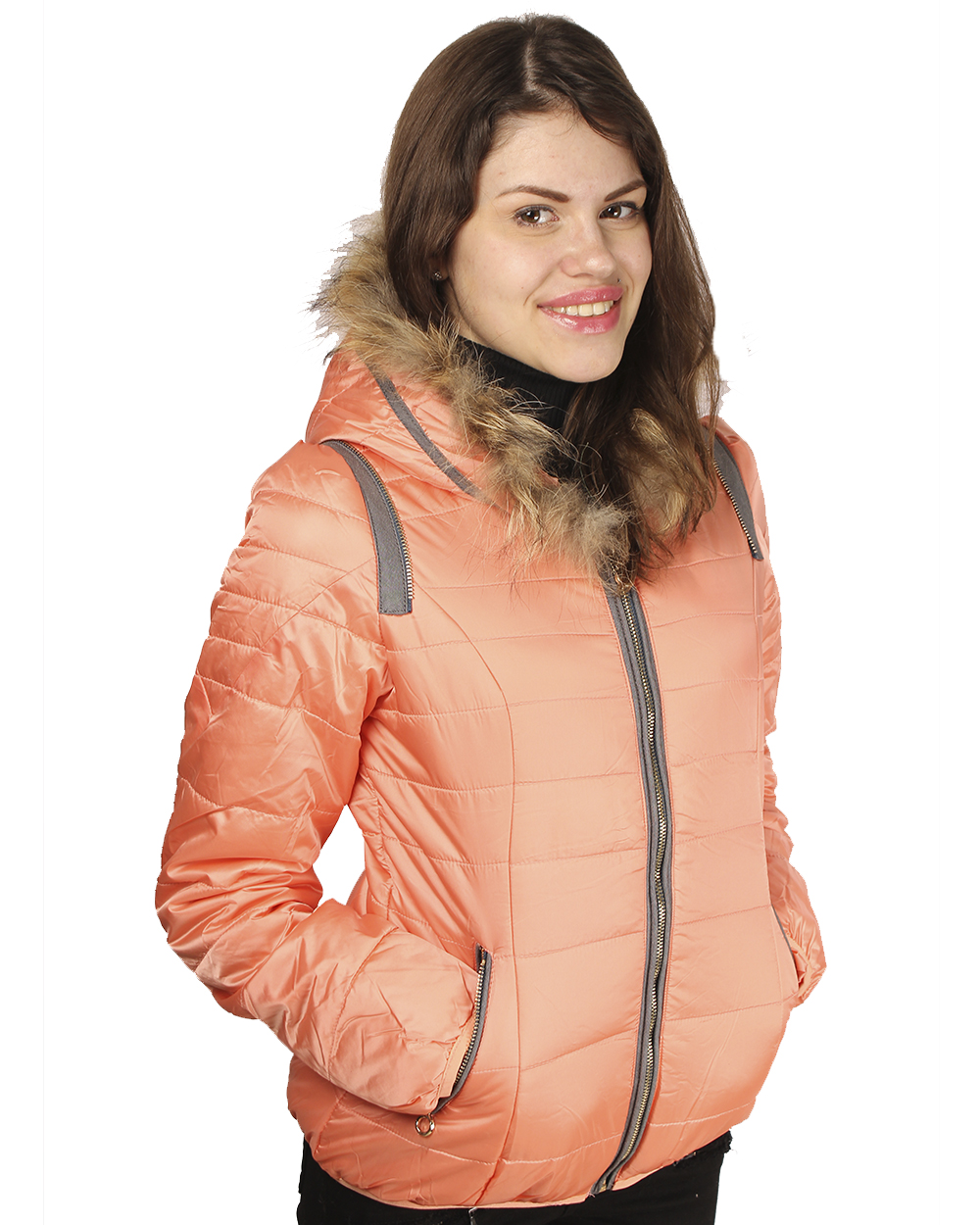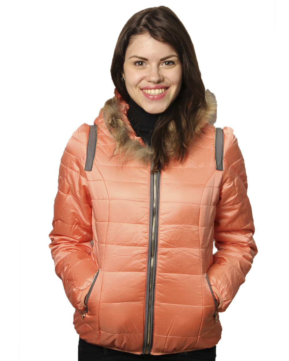 Женская куртка коралового цвета на синтепоне. Капюшон украшен натуральным мехом