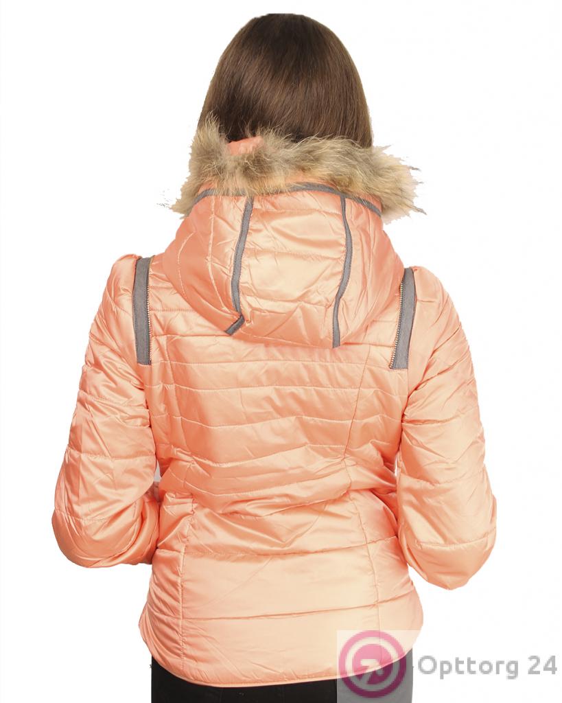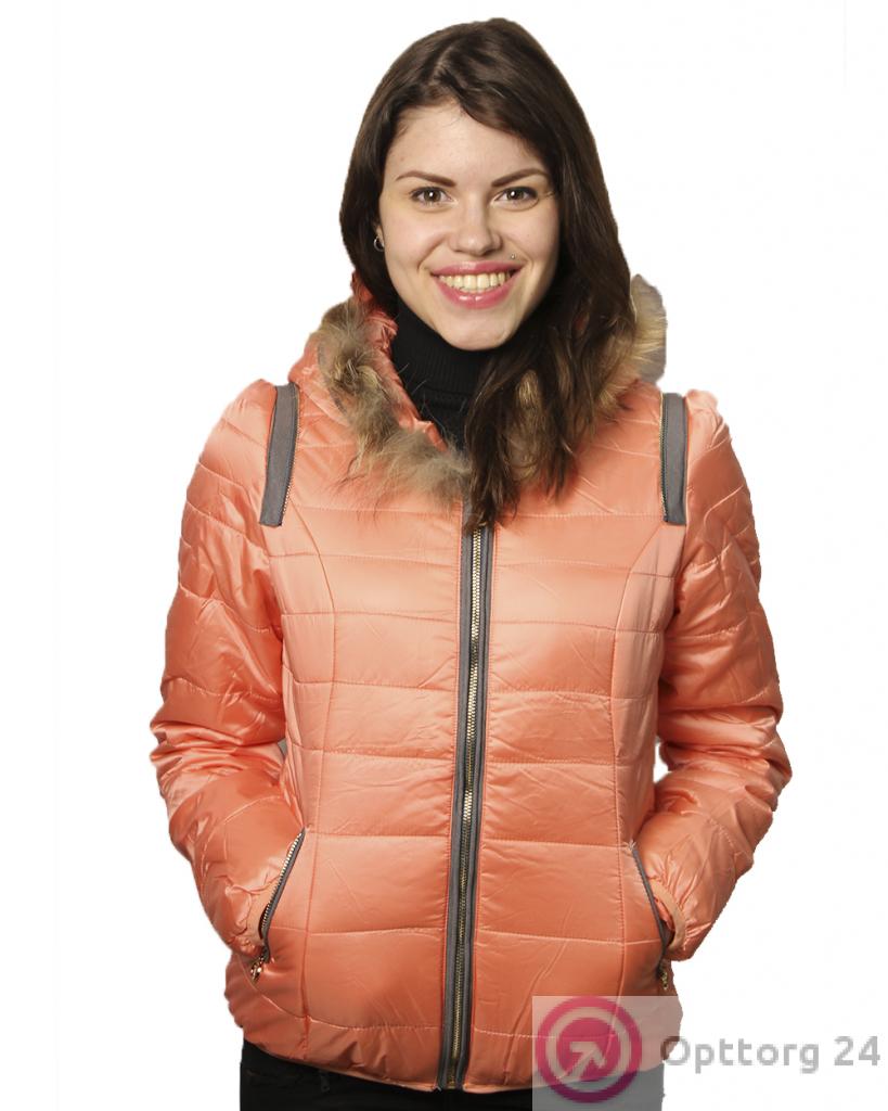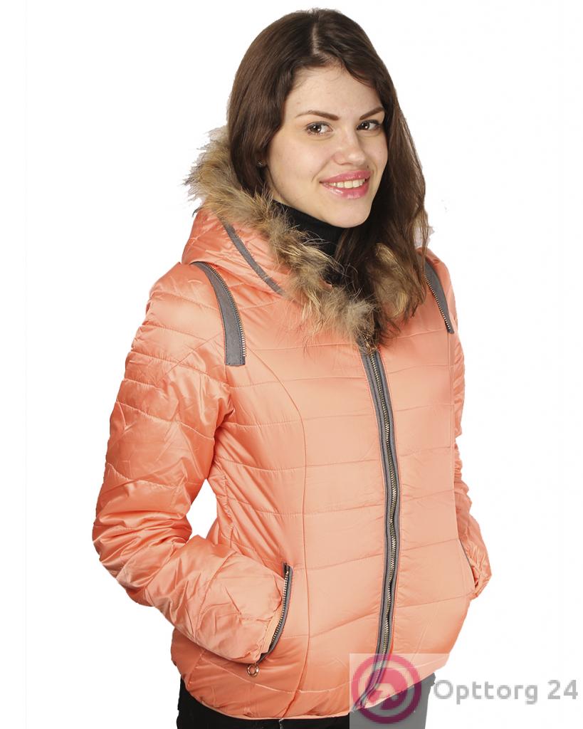 Женская куртка караллового цвета с натуральным мехом на капюшоне оптом