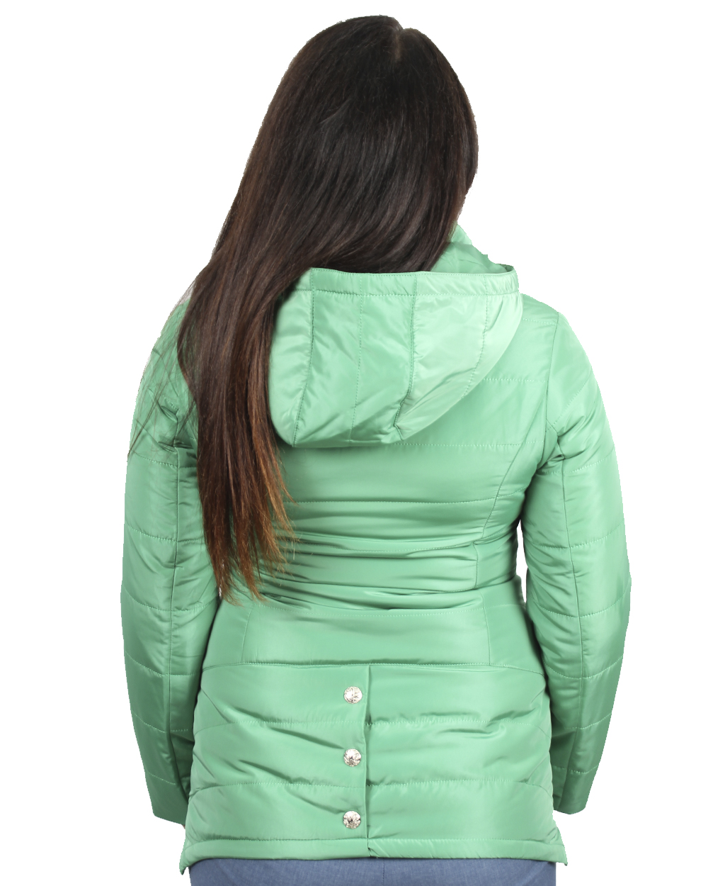 Куртка женская нейтрального ментолового цвета с капюшоном и карманами на молнии.