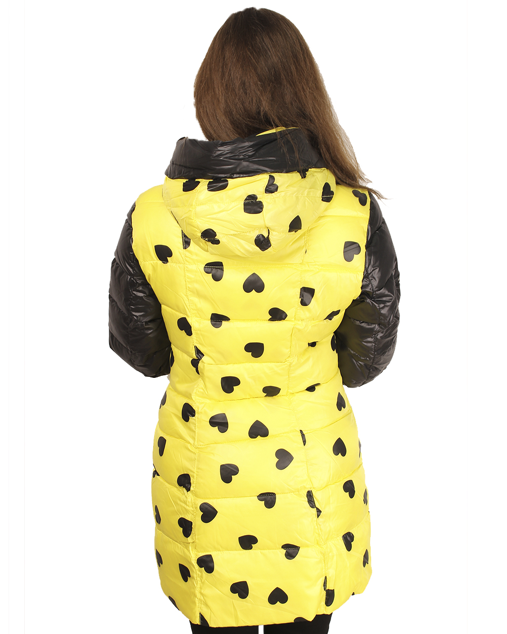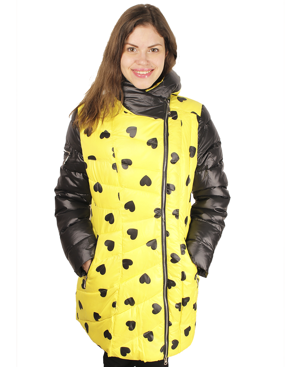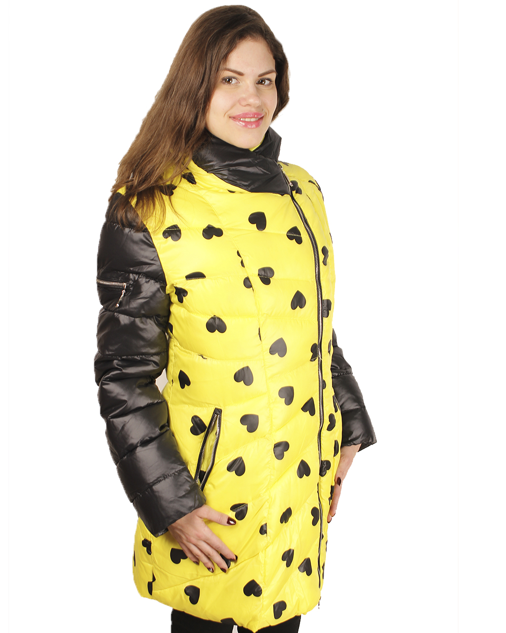 Женская удлинённая куртка на синтепоне ярко-желтого цвета с черными рукавами в горошек.
