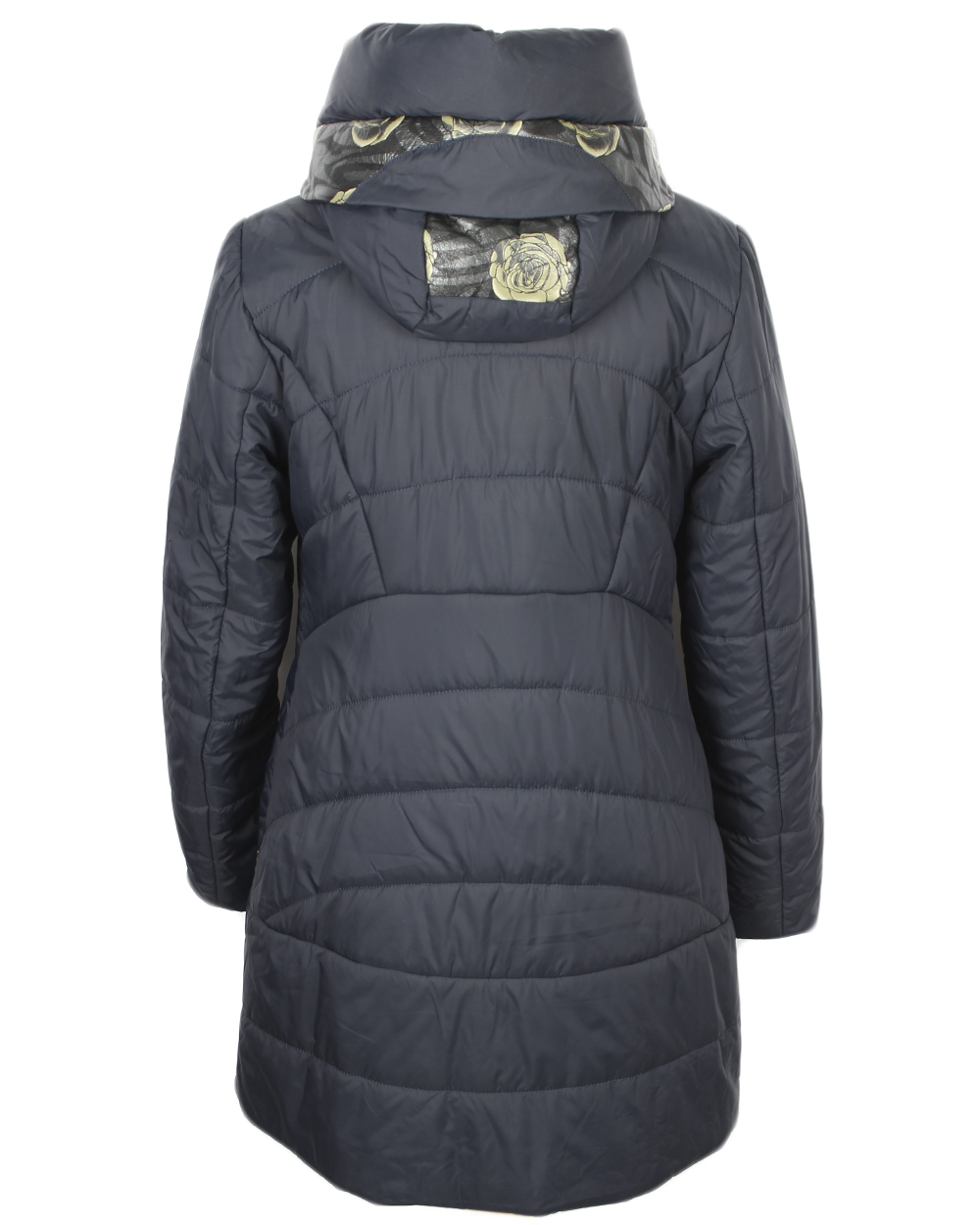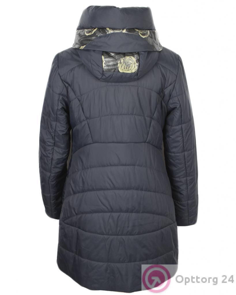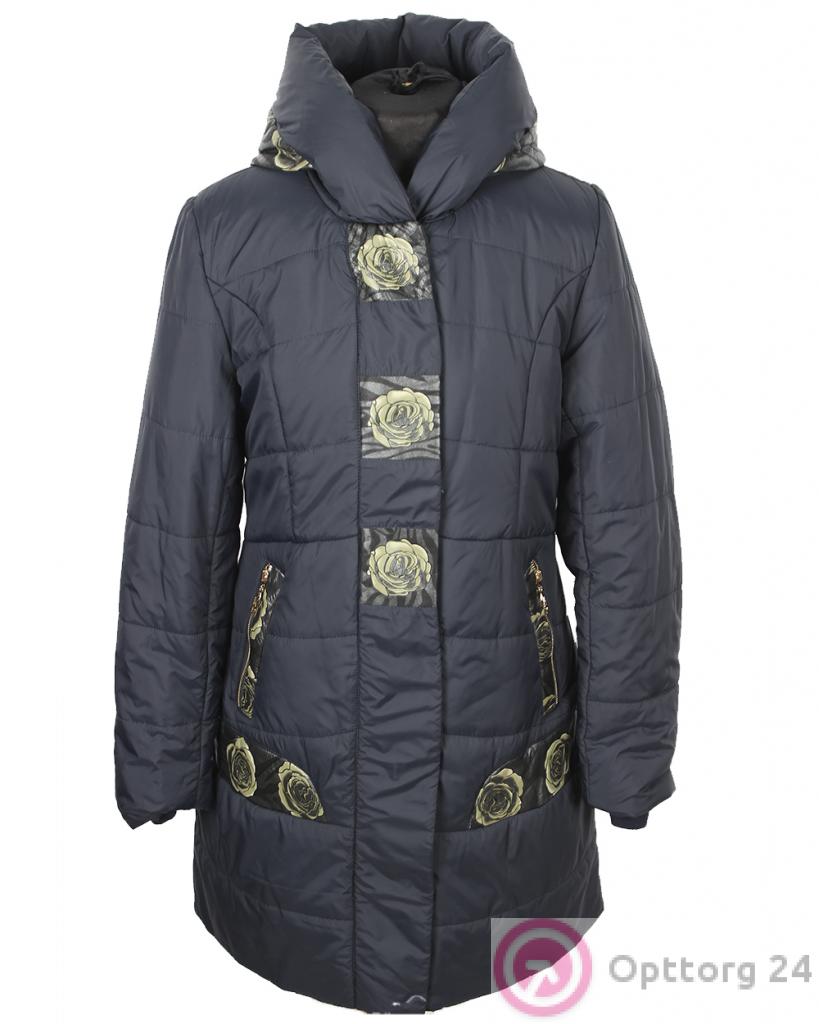 Женская куртка тёмно-синего цвета с вставками из экокожи с нанесенным на них рисунком в виде цветка.