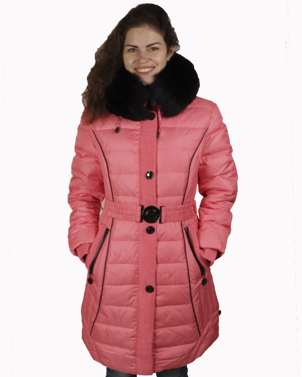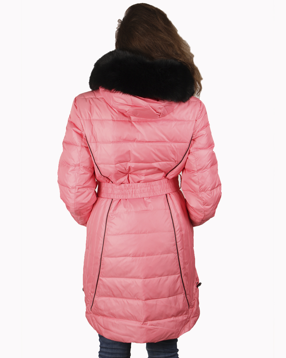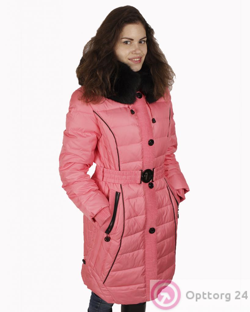 Женский пуховик нежно розового цвета с меховым воротником оптом