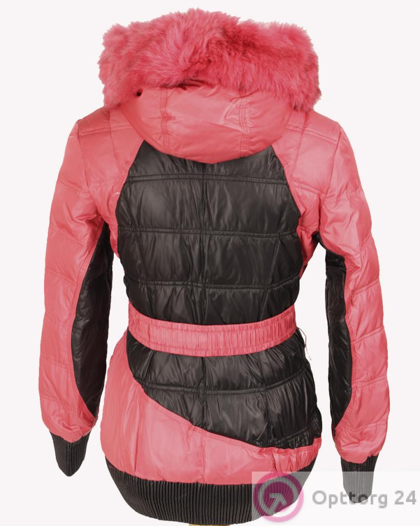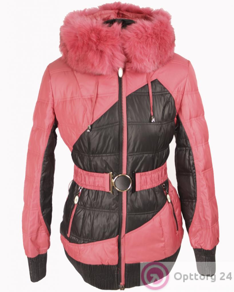 Женский пуховик розового-черного цвета с мехом на вороте оптом