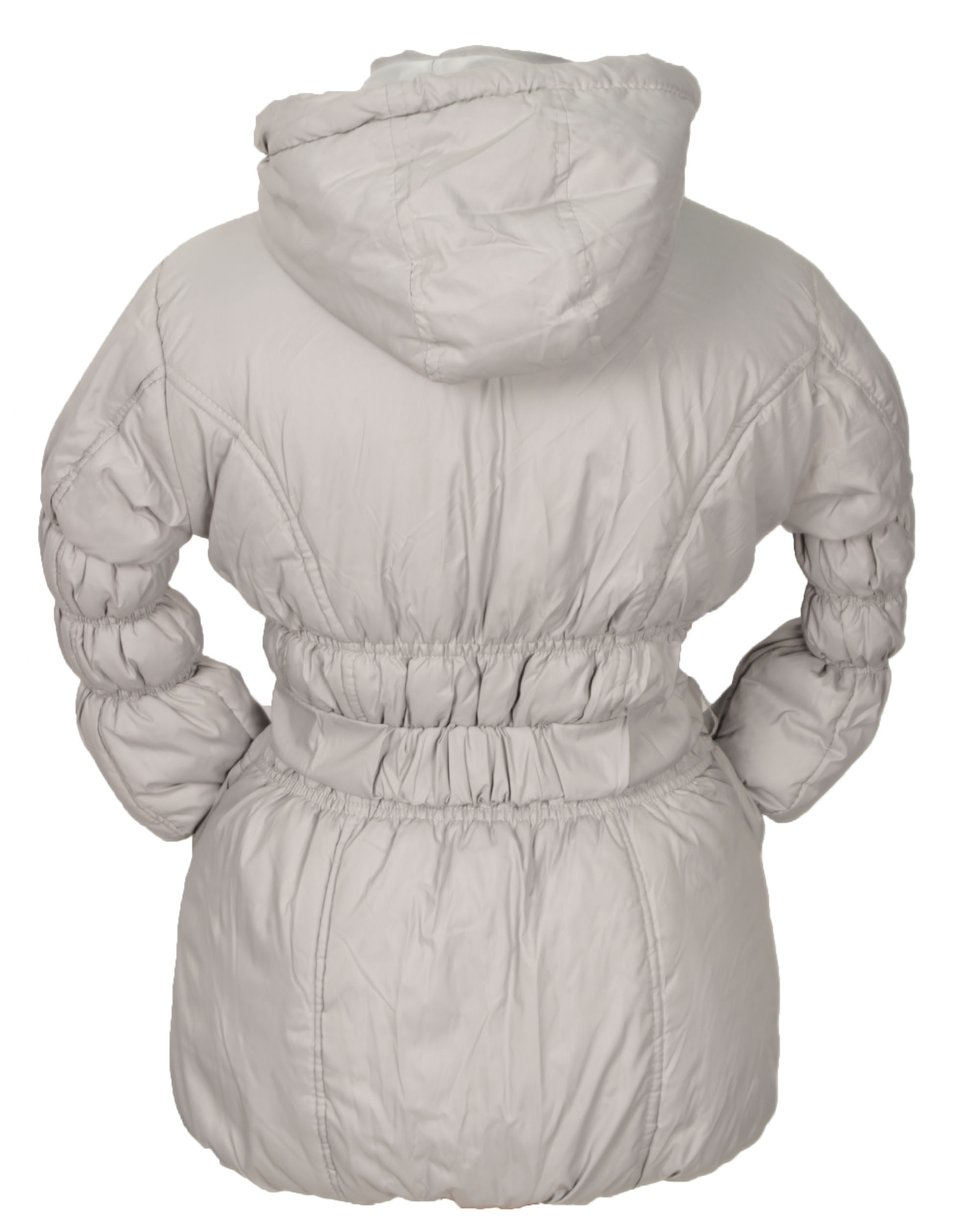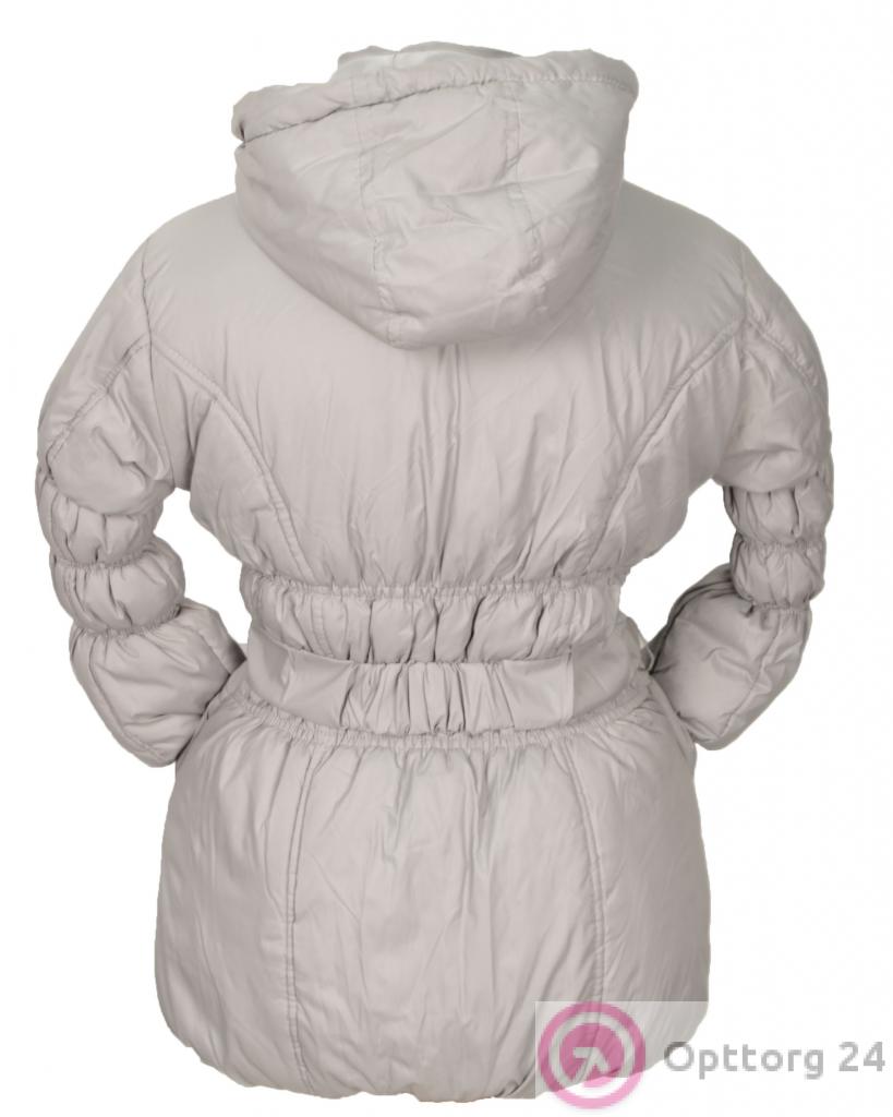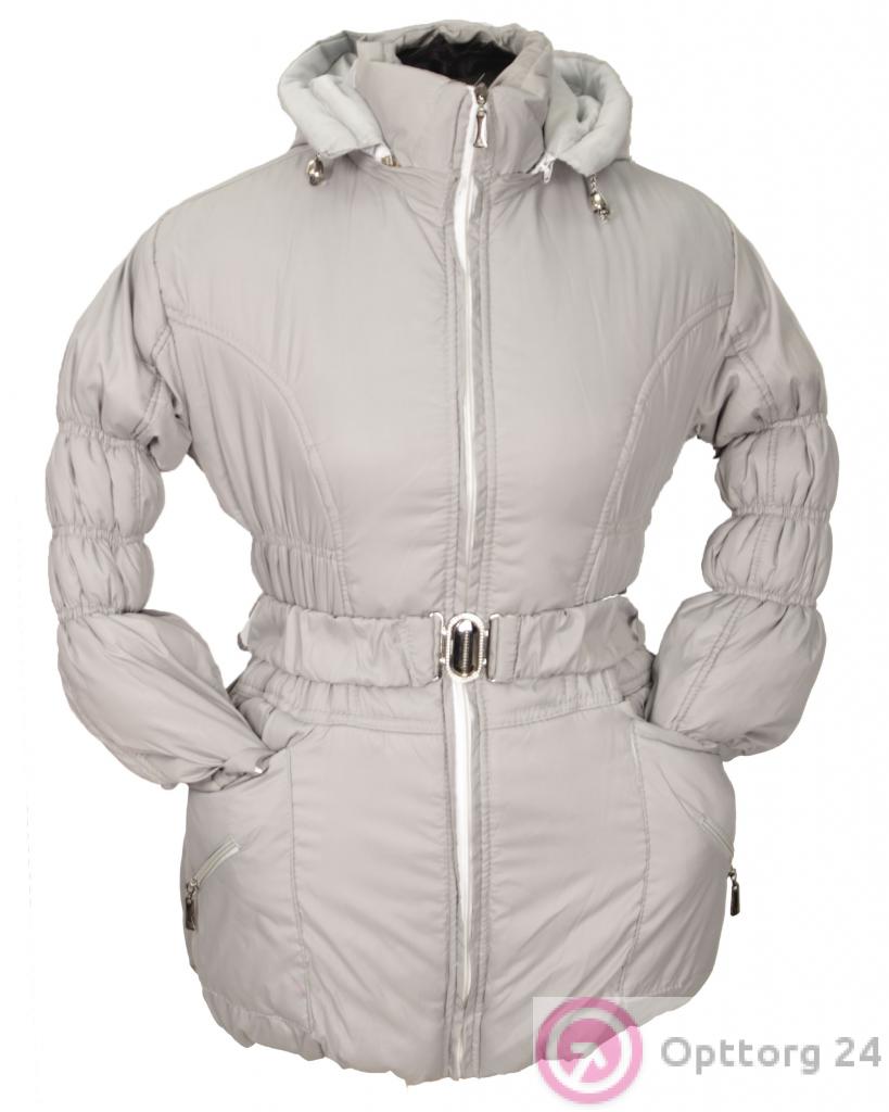 Куртка женская на синтепоне серого цвета с капюшоном и поясом.