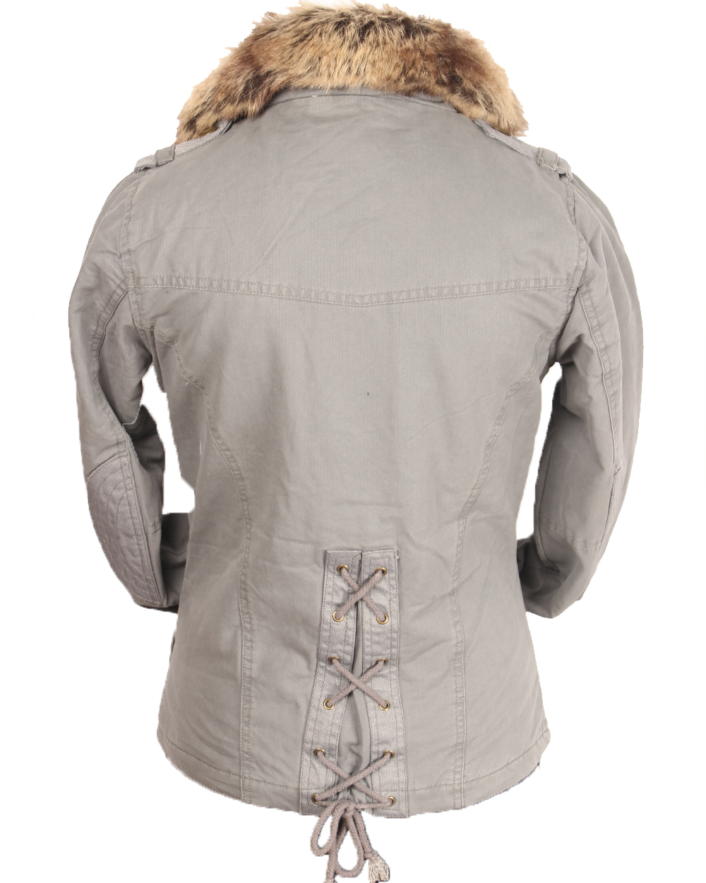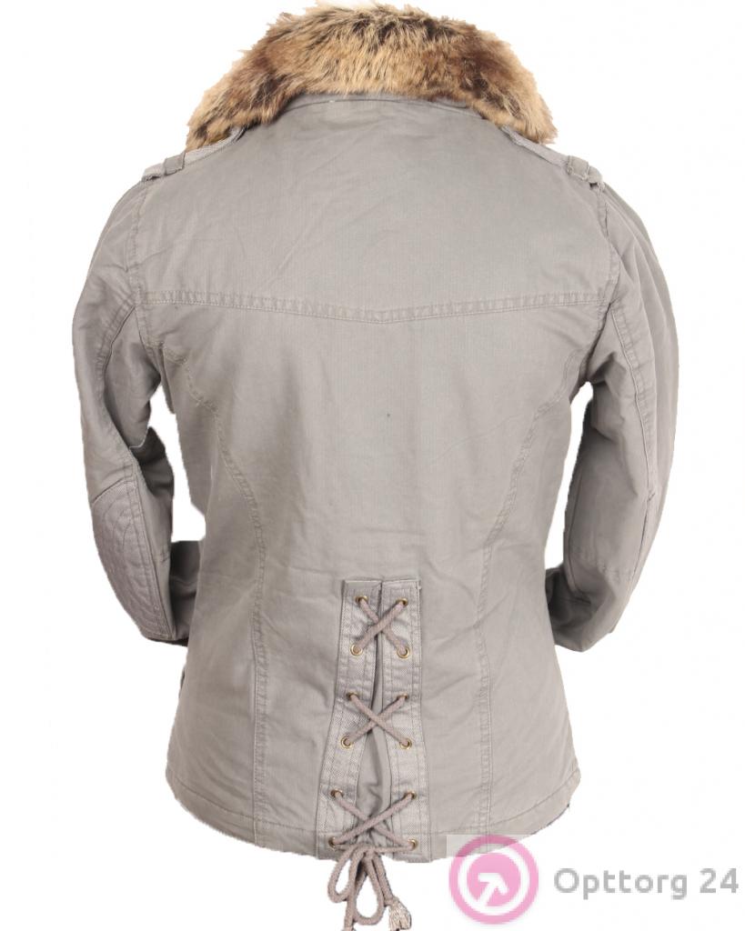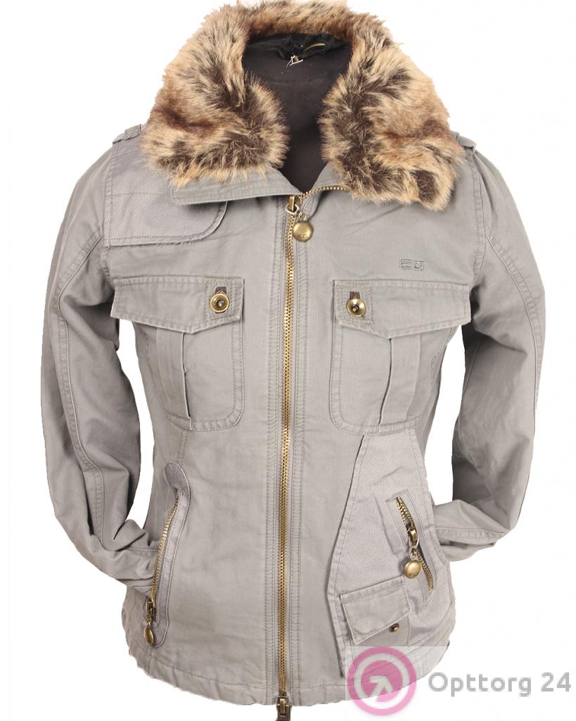 Женская куртка, демисезонная. Модель серого цвета с мехом на воротнике.