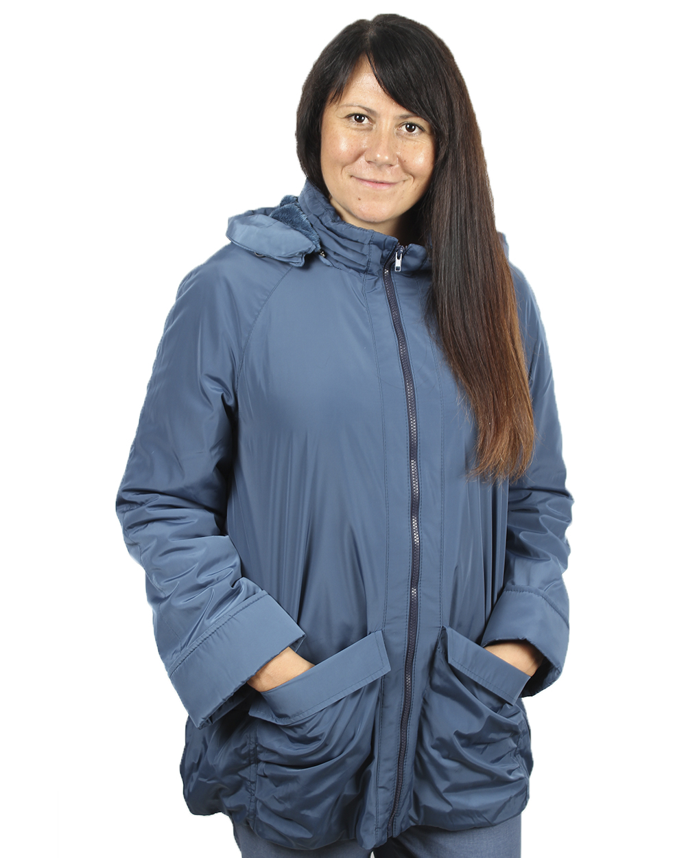 Куртка женская синего цвета с двойными карманами по бокам и нежной на ощуп плюшевой подкладкой с внутренней стороны изделия.