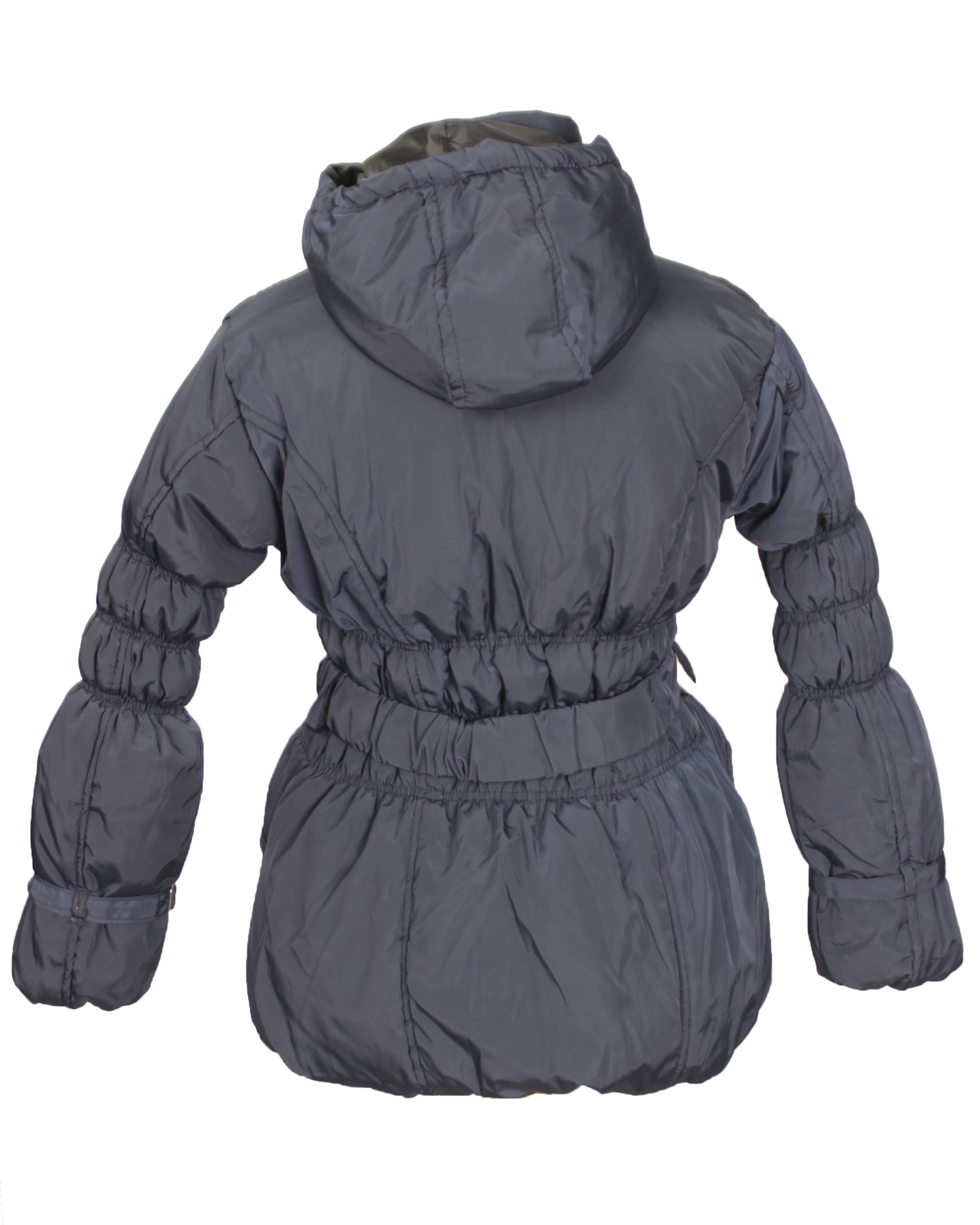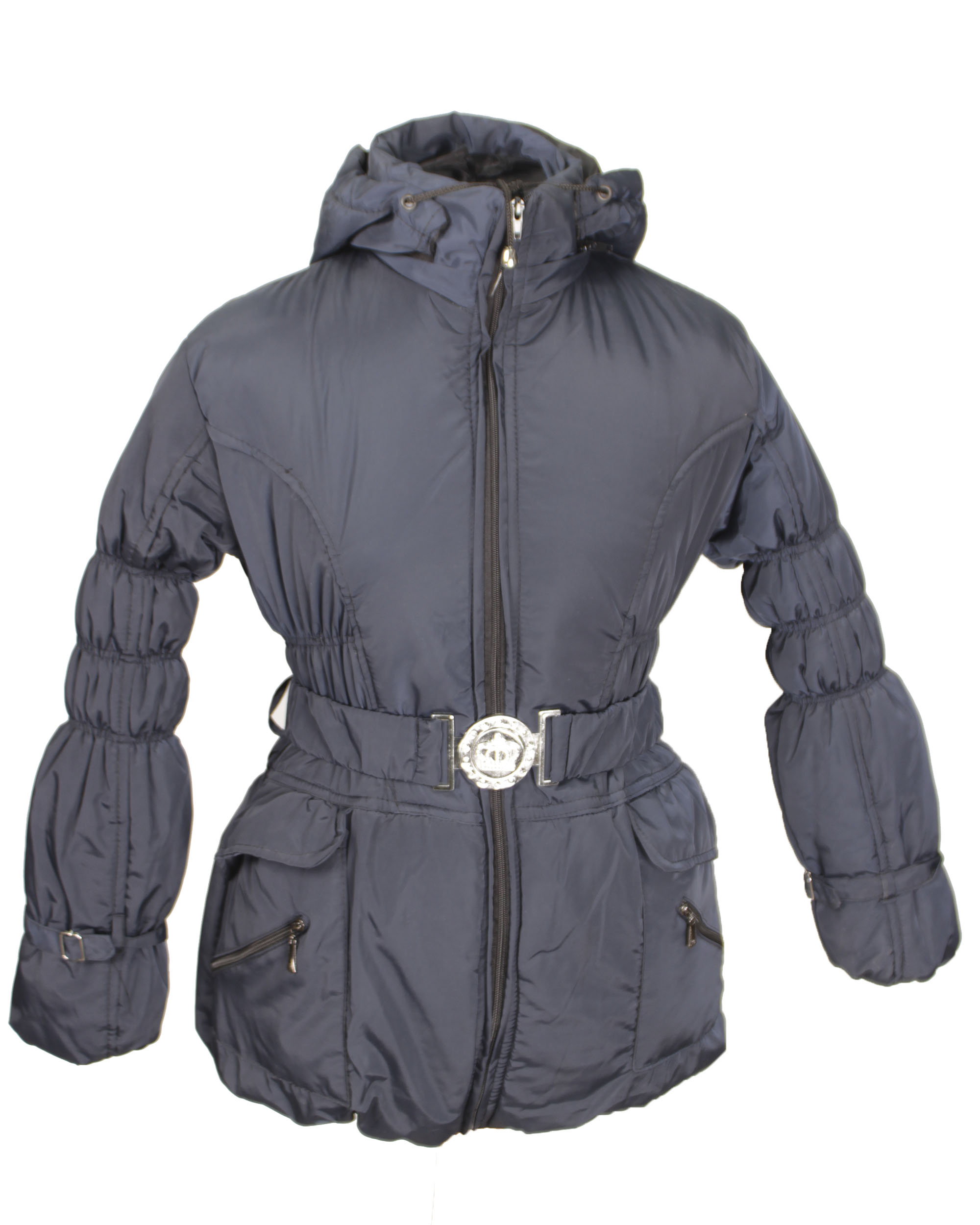Женская приталенная куртка на синтепоне, тёмно синего цвета с поясом.