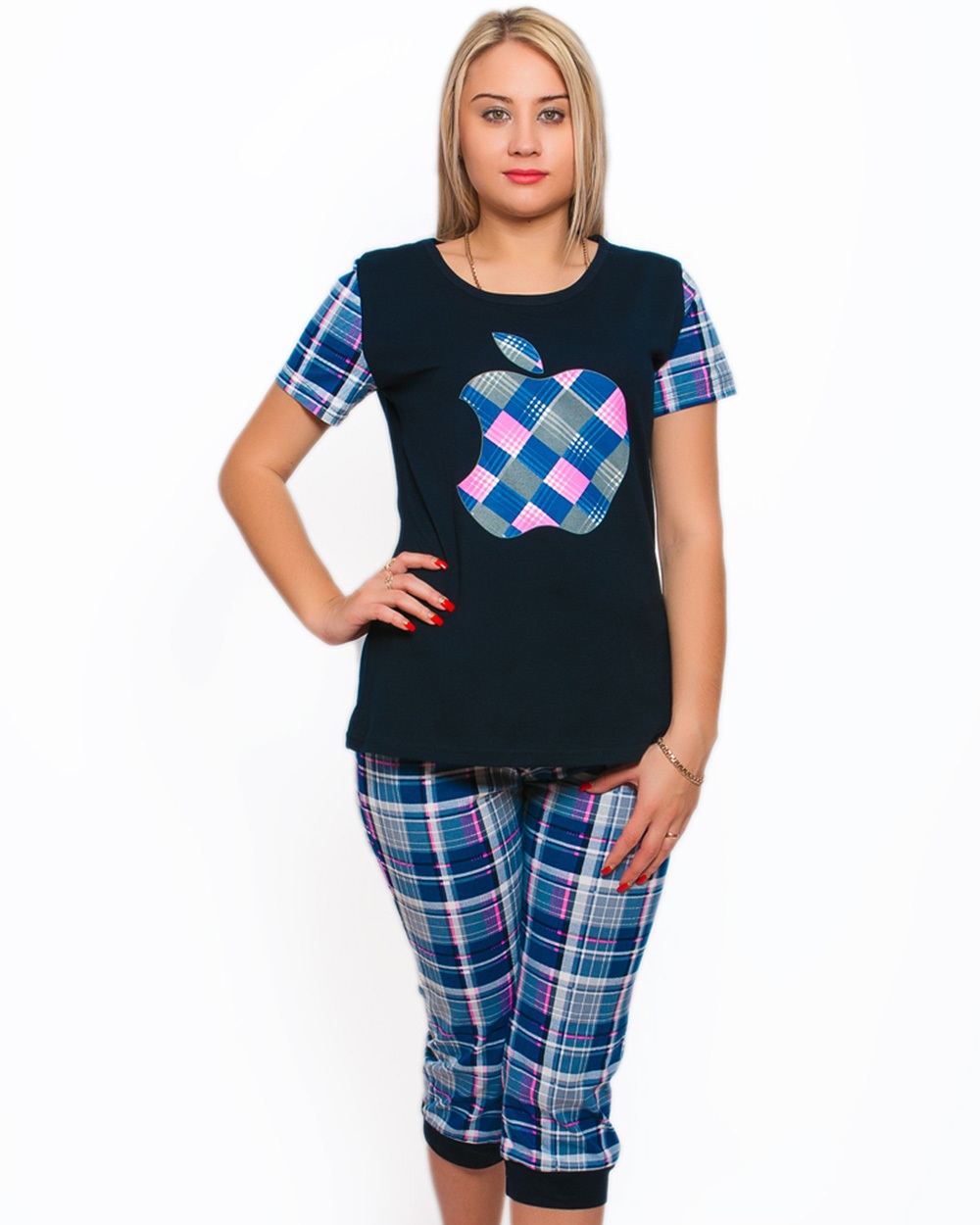 Женскаяч пижама темного цвета с клетчатыми рукавами и штанами. на груди расположен огрызок яблока в клетку.