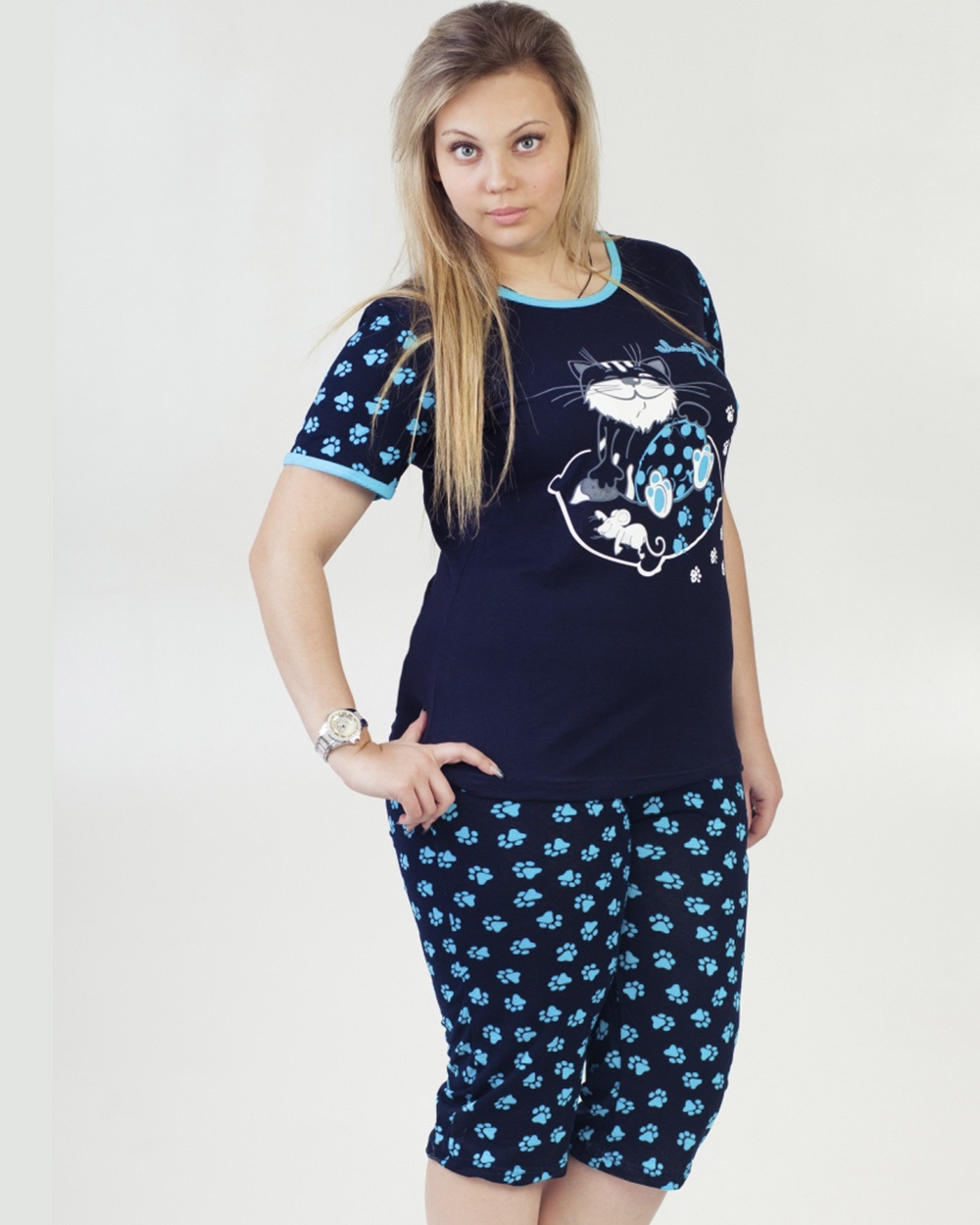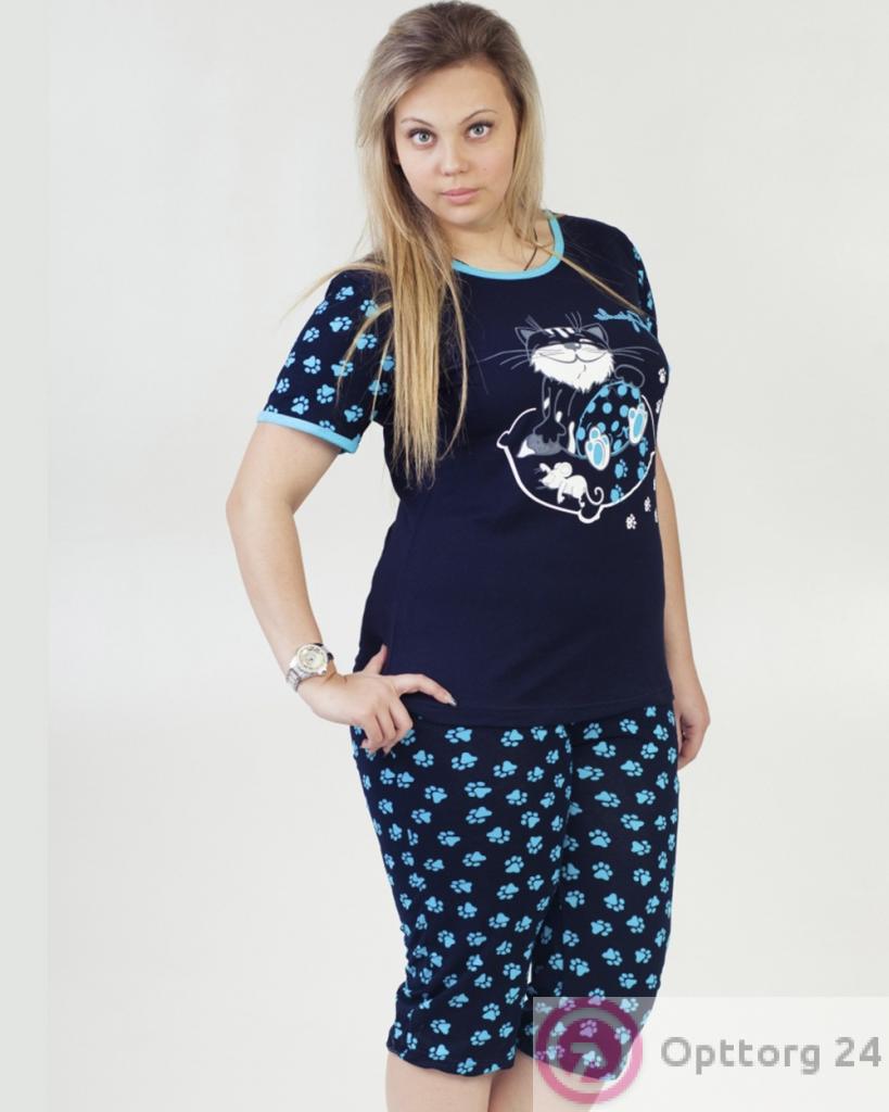 Женская пижама тёмно-синего цвета с принтом в виде кота. оптом