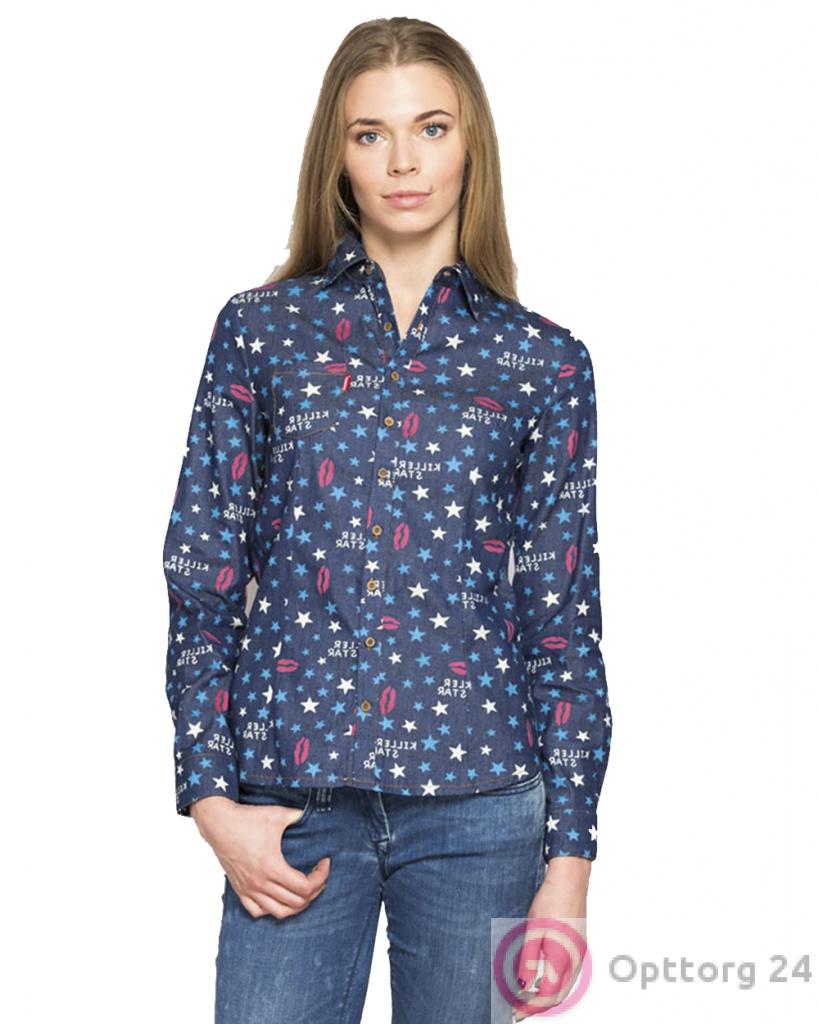 Женская рубашка синего цвета с мелким рисунком по всей поверхности. оптом