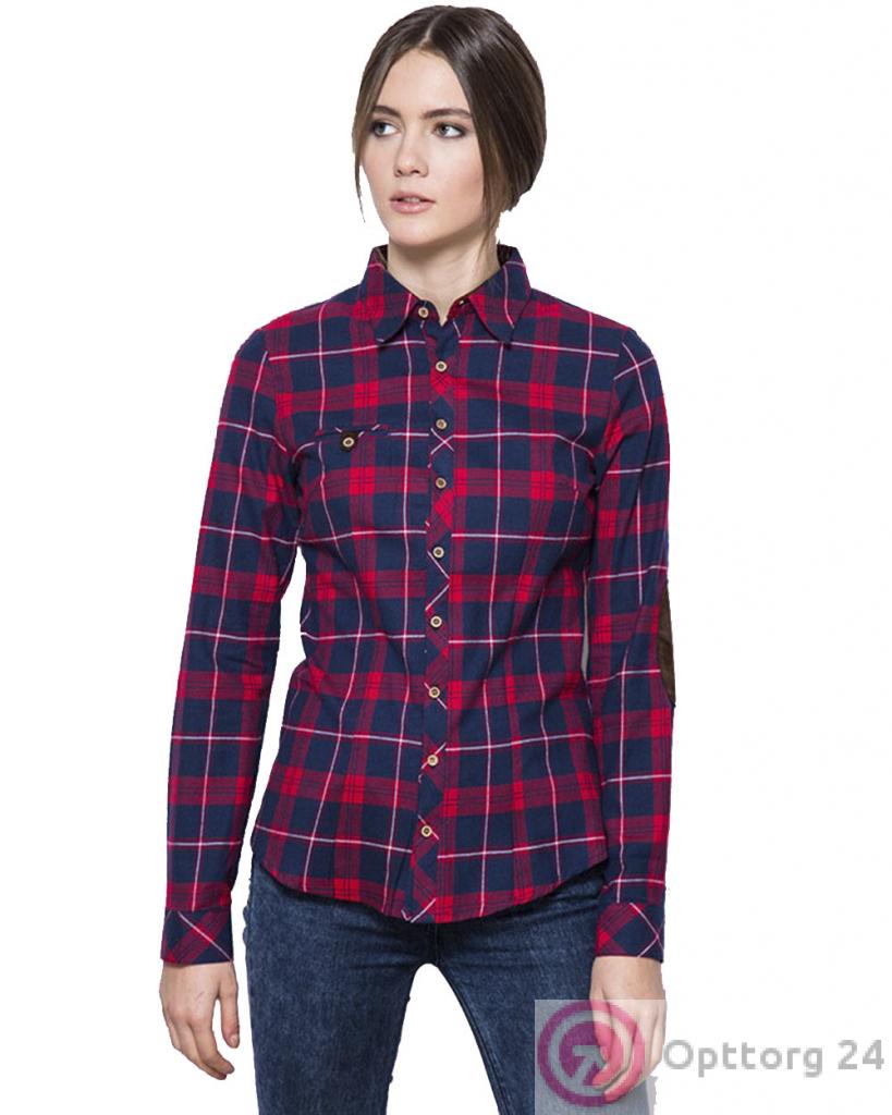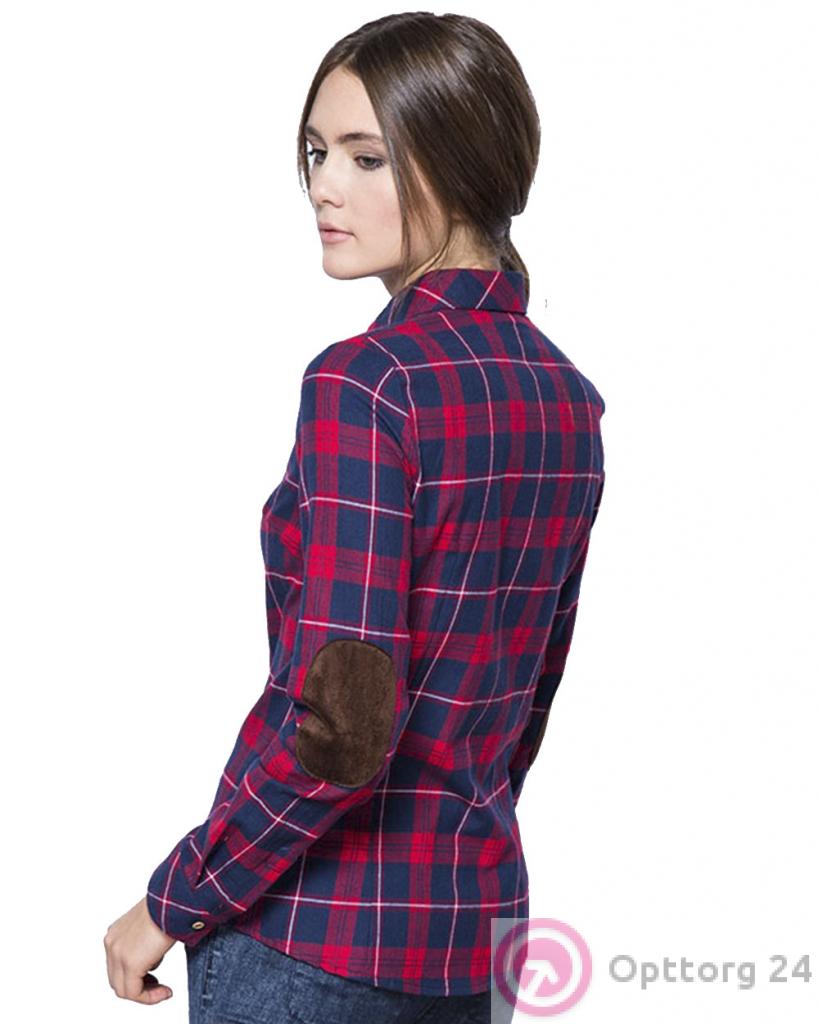 Стильная женская рубашка красно-синего цвета с накладками на локтях.
