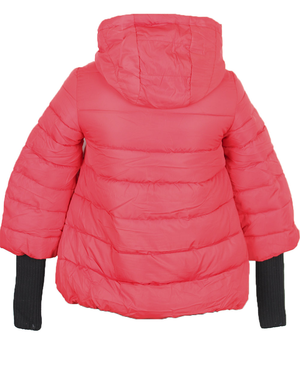 Женская куртка утепленная, стеганая на синтепоне 200гр. Модель красного цвета с черными рукавами и капюшоном.