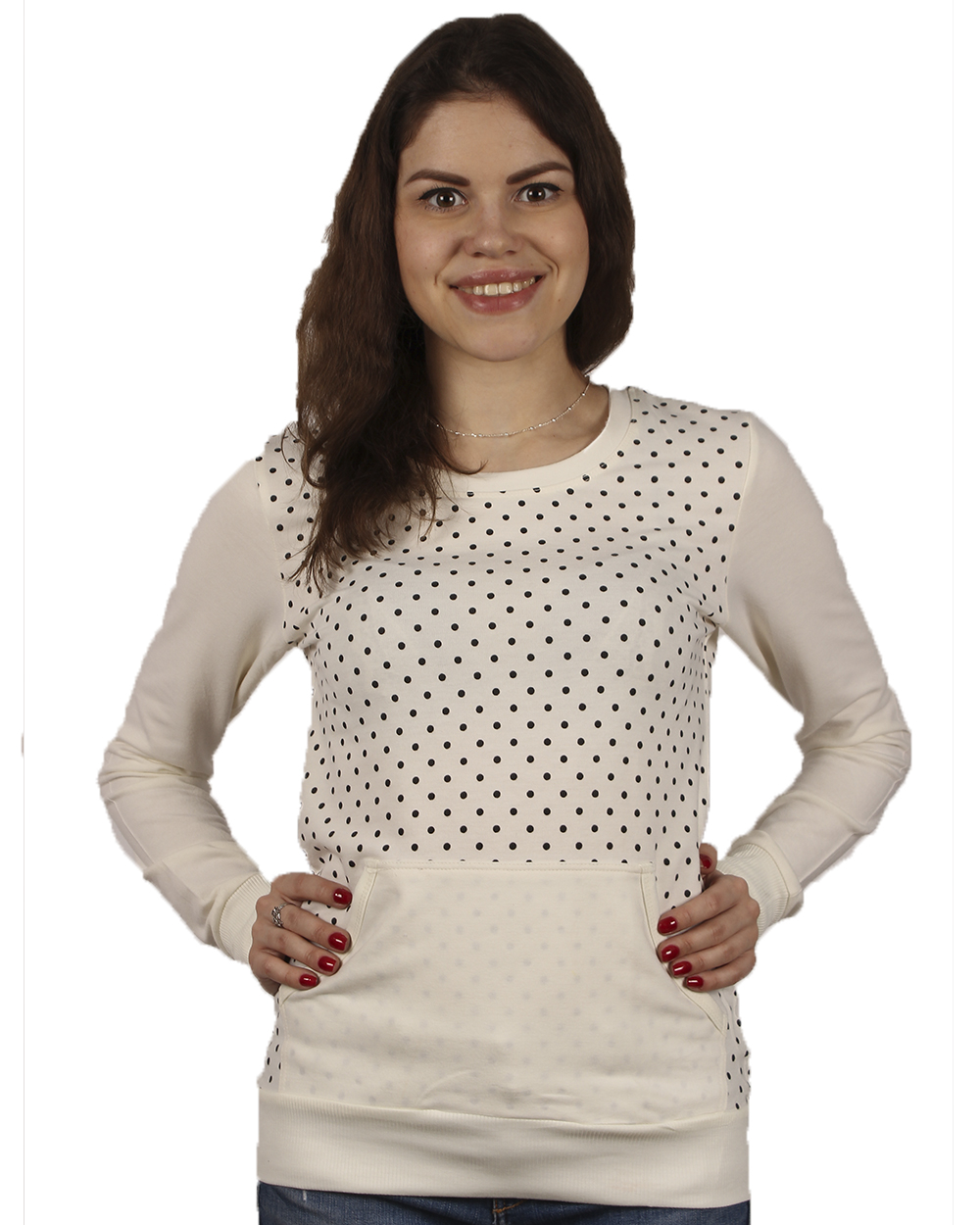 Женская толстовка "Кенгуру" с карманом на передней части модели. Изделие молочного цвета с мелким горохом по всей поверхности.