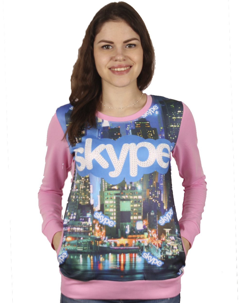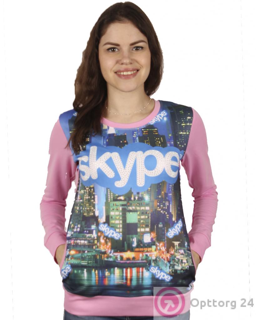 Женская толстовка нежно-роззового цвета, с цветным принтом и логотипом "skype".