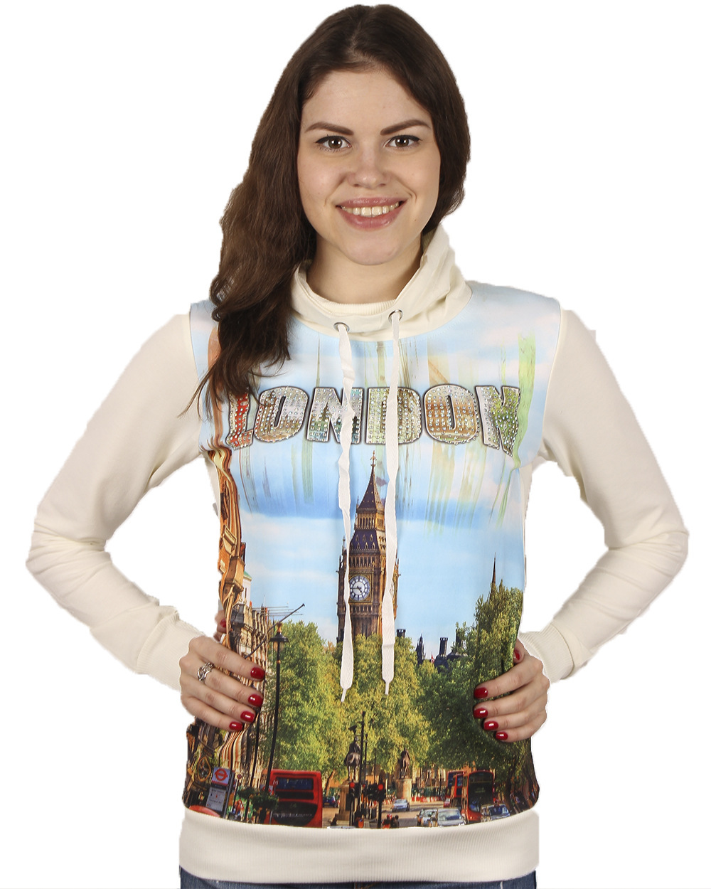 Женская толстовка белого цвета типа "Худди" с ярким цветным принтом на передней части изделия.