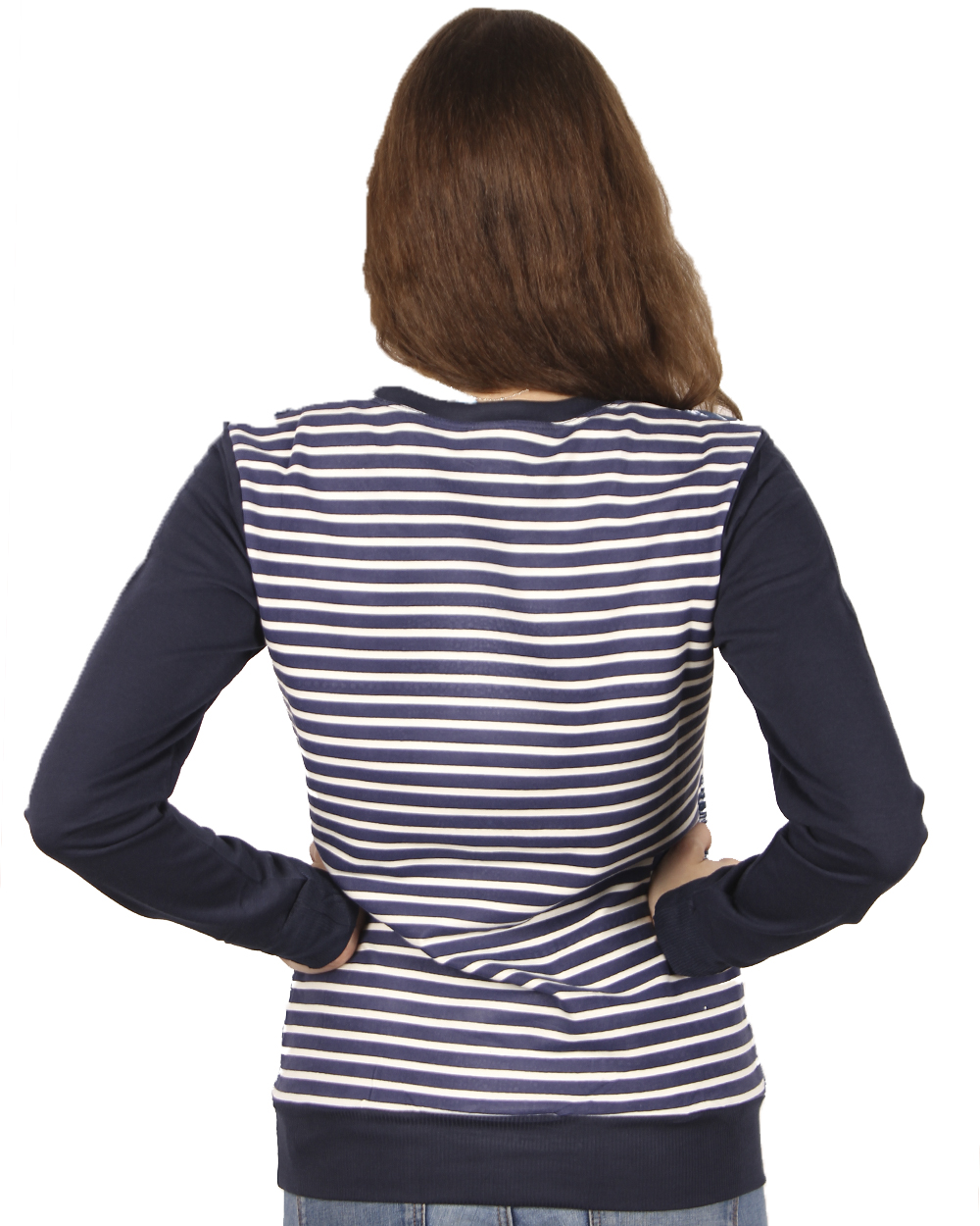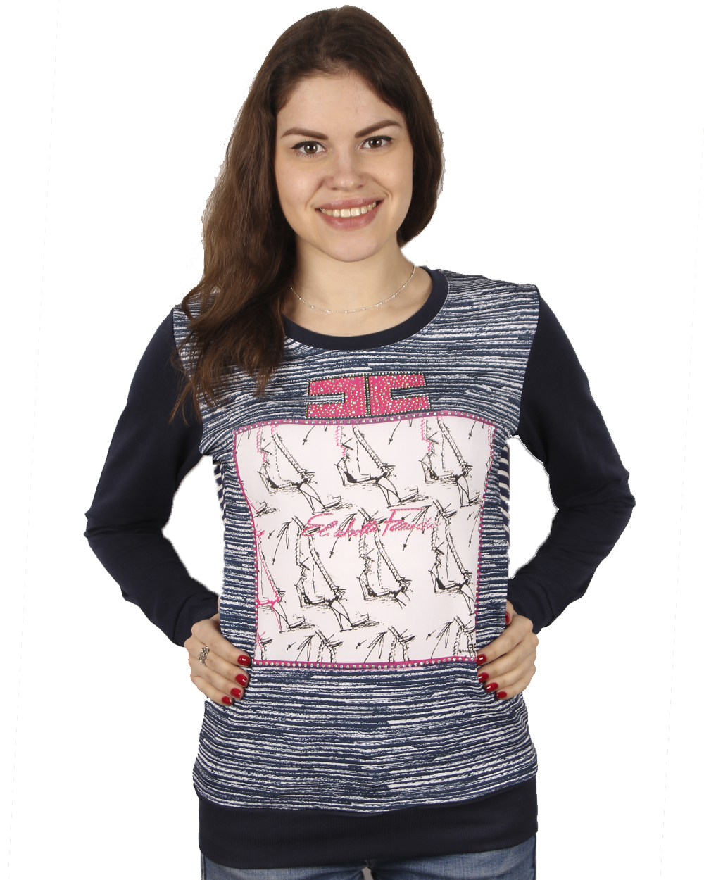 Женская толстовка тёмно-синего цвета с ярким, цветным принтом.