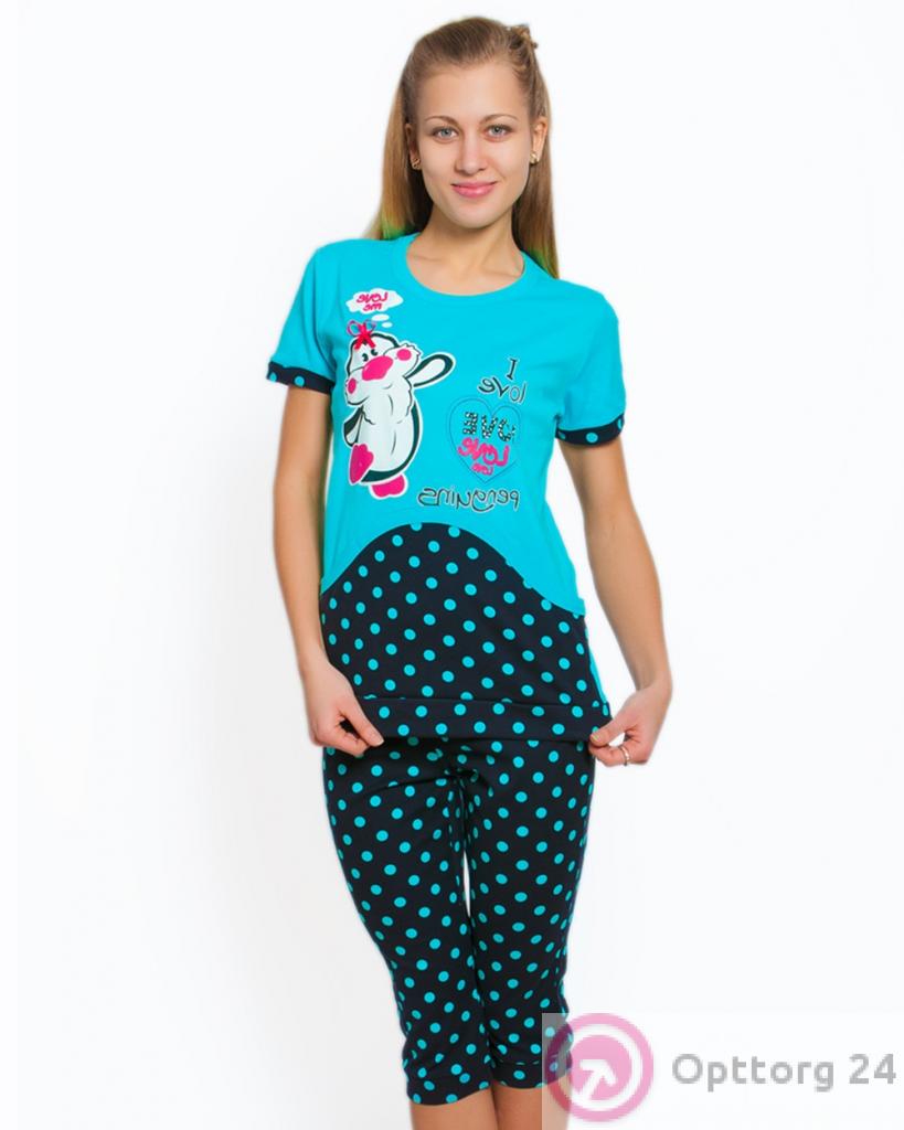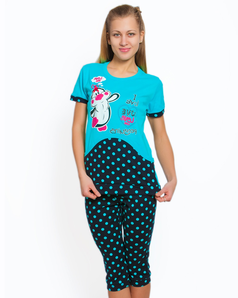 Женская трикотажная пижама синего цвета с штанами в горошек. оптом