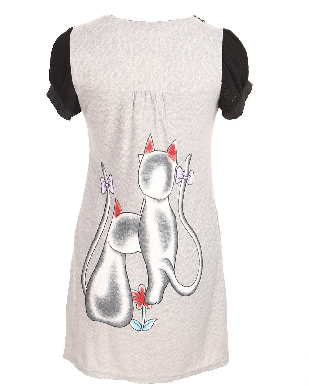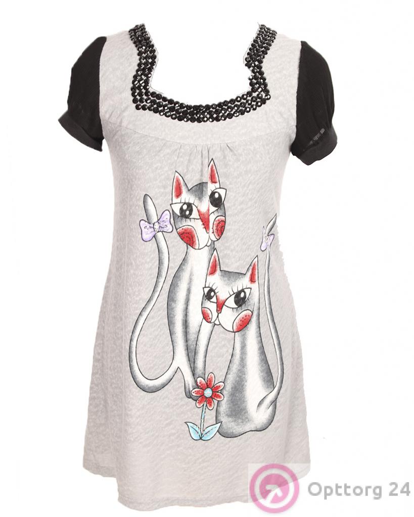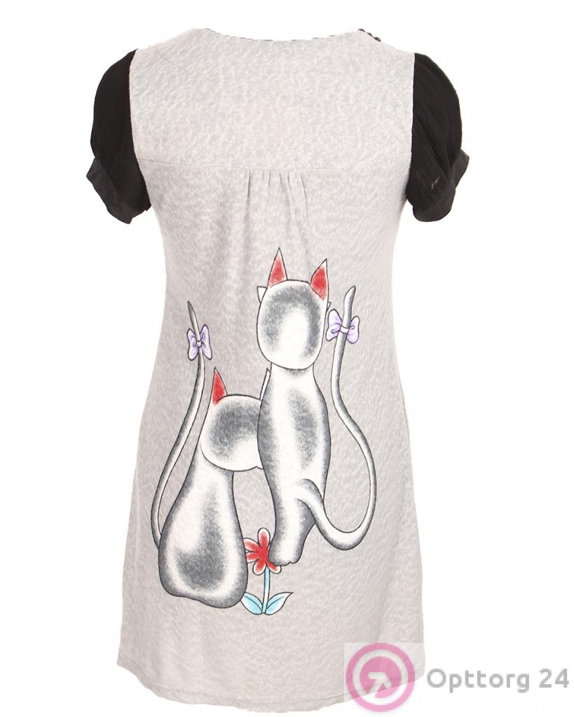 Женская туника серого цвета с рисунком в виде кошек на обеих сторонах оптом