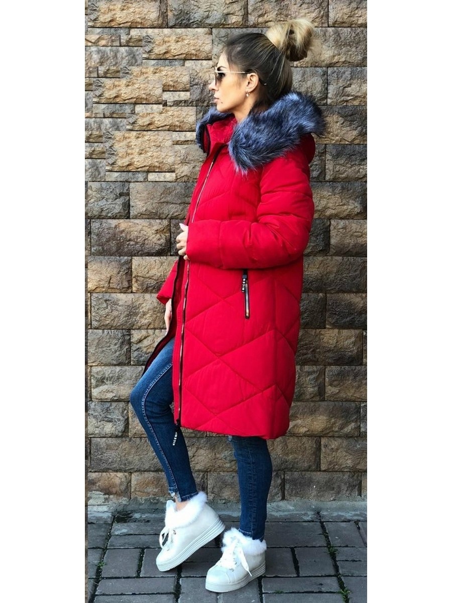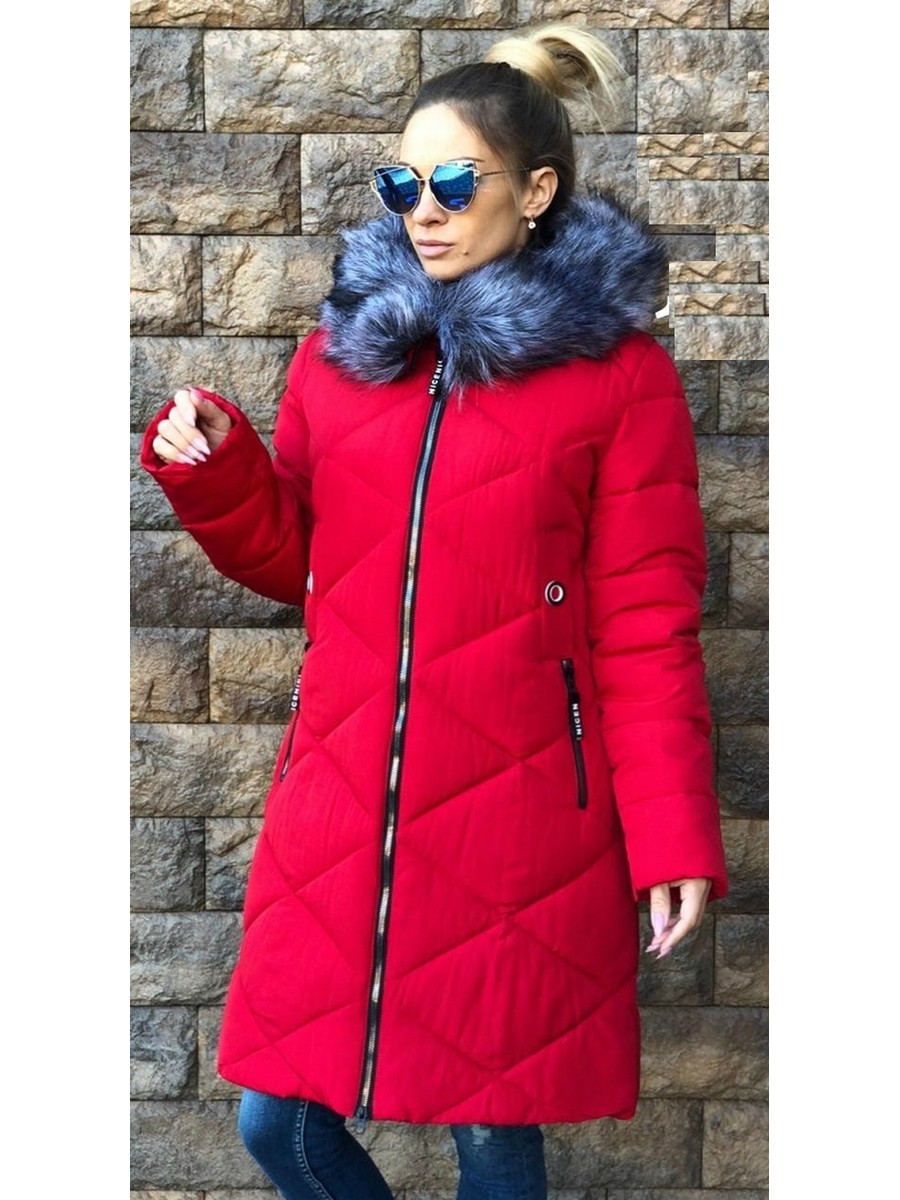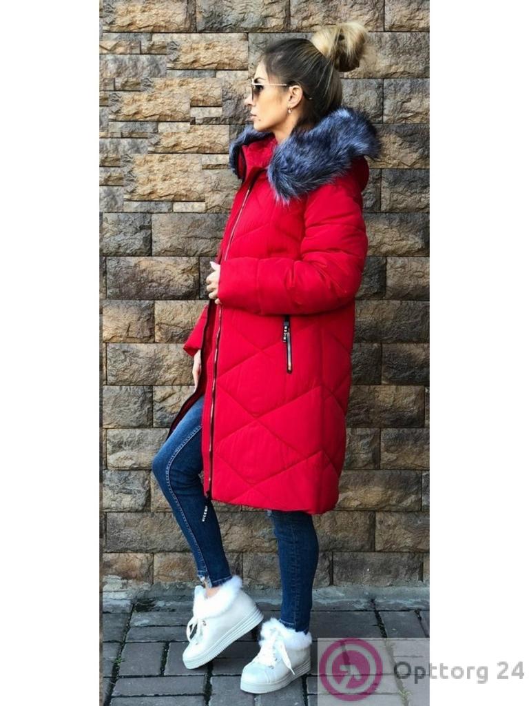 Женская малиновая куртка длиной ниже колена, капюшон с черным мехом. Декорирована пуговицами. По центру - молния. Очень теплая и удобная.