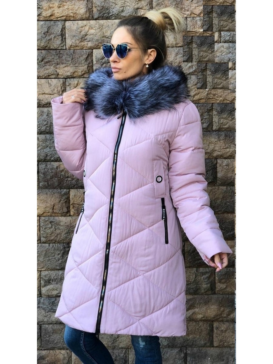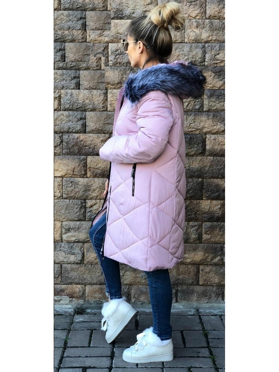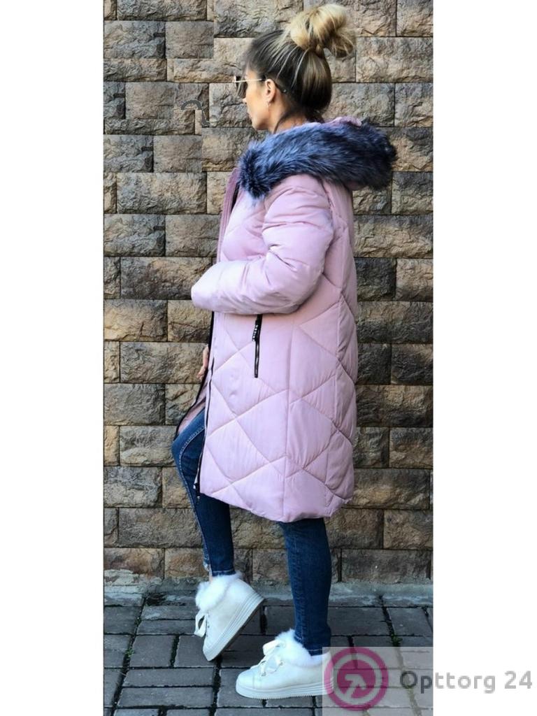 Женская удлиненная куртка розового цвета с капюшоном с черным мехом. Свободный силуэт. Очень теплая и удобная.