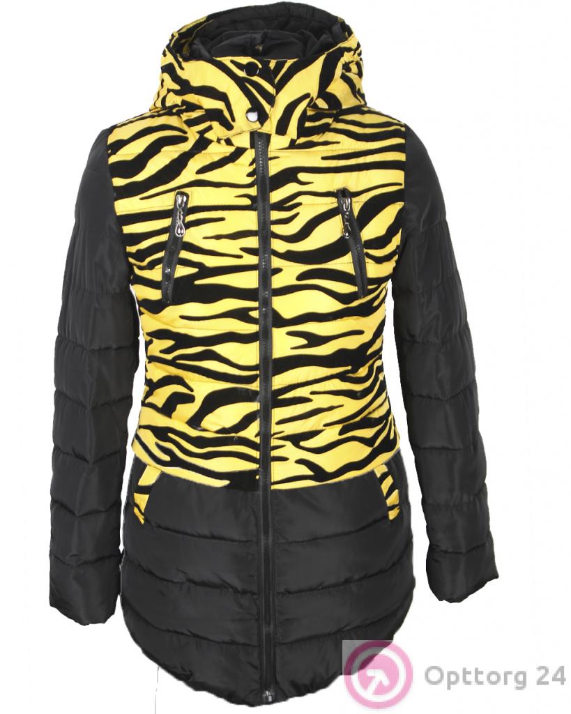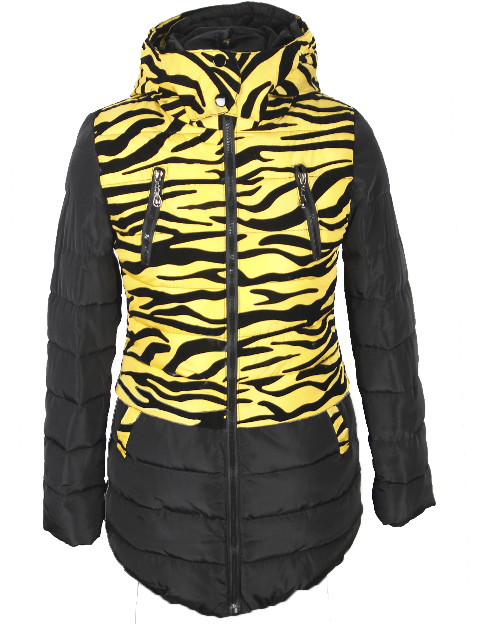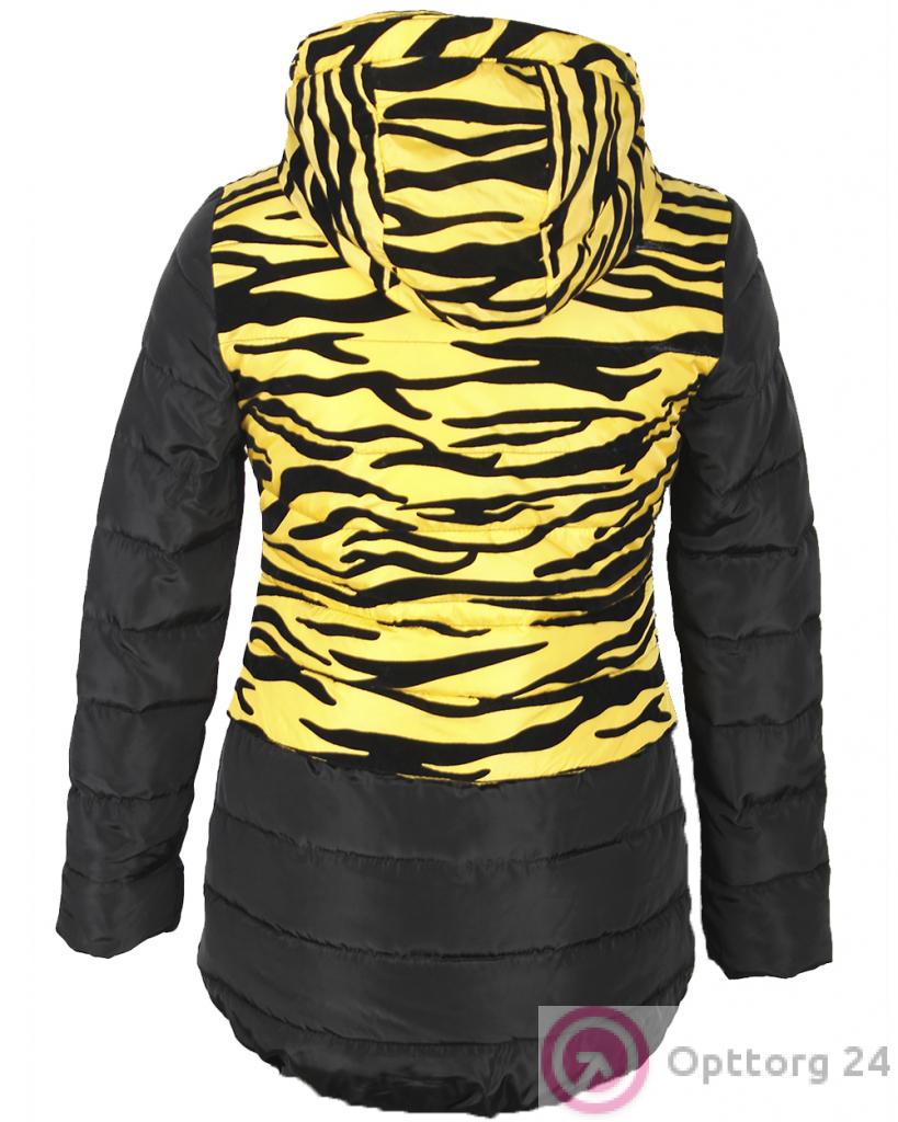 Женская куртка черно-желтого цвета с тигровой расскраской.