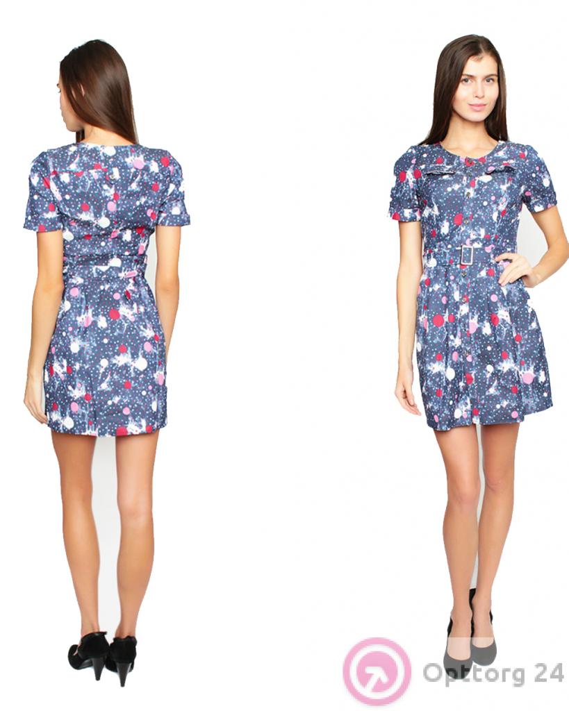 Женское платье джинсового цвета с мелким принтом нанесенным по всей поверхности модели. Платье оснащено поясом и двумя нагрудными карманами.