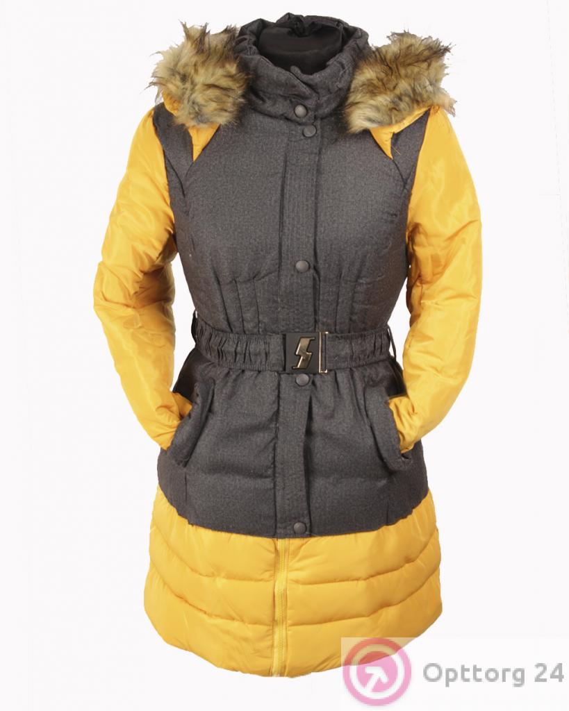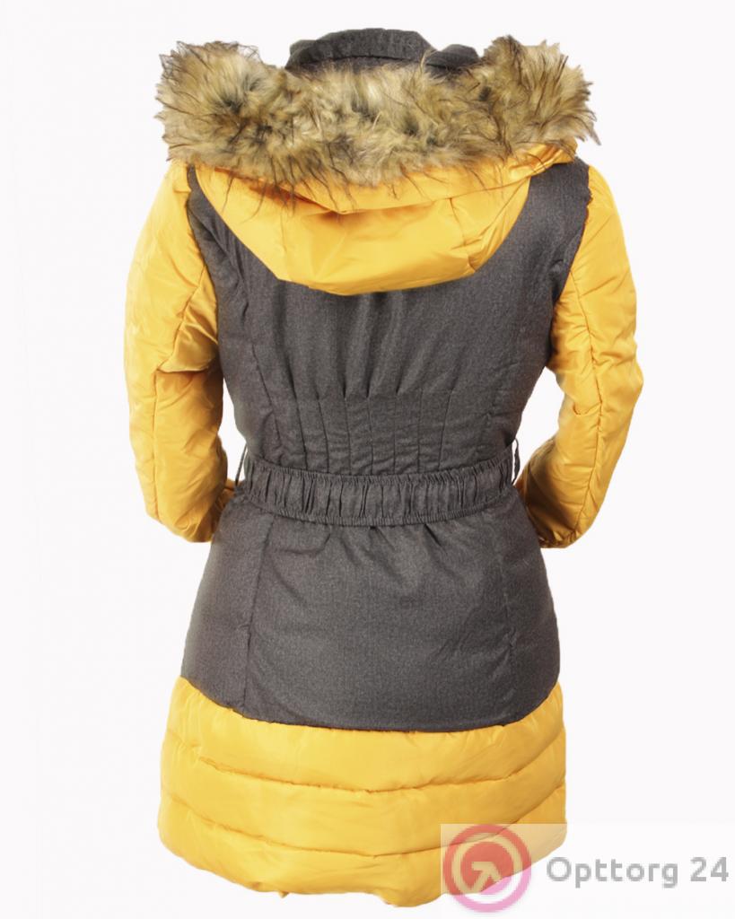 Стильный женский пуховик жёлто-черного цвета. Капюшон украшен мехом.