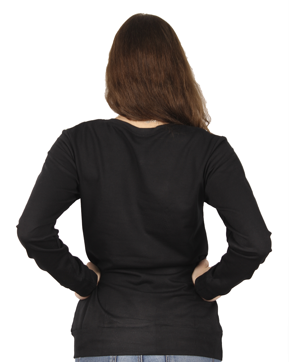 Женский джемпер черного цвета с ярким, цветным принтом на передней части модели.